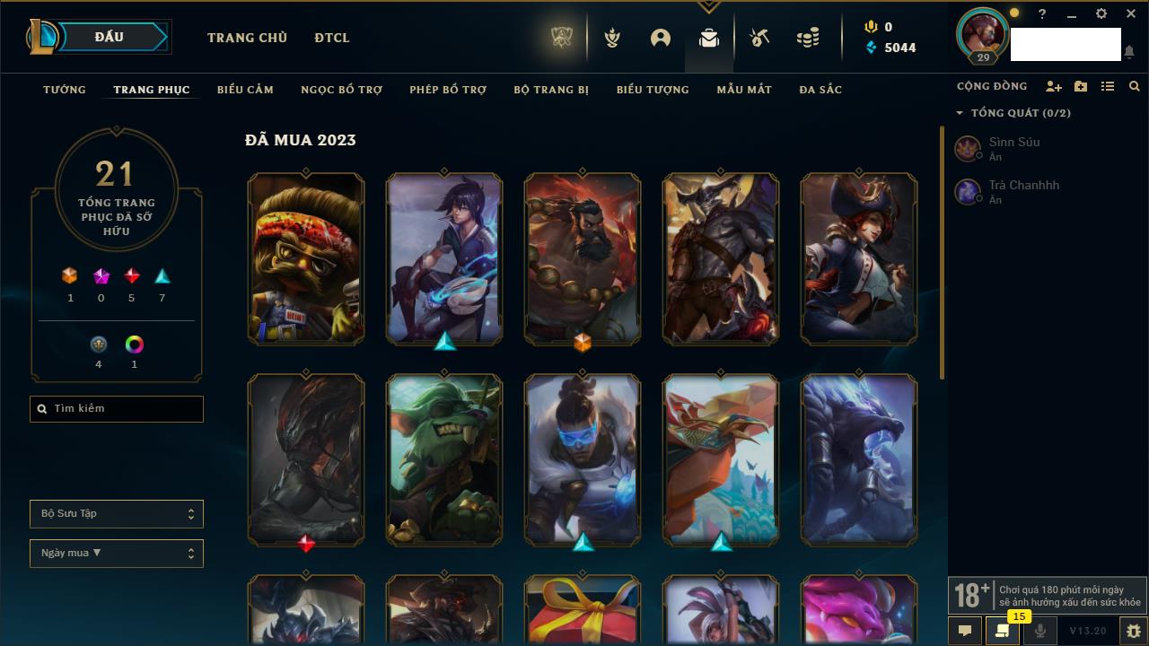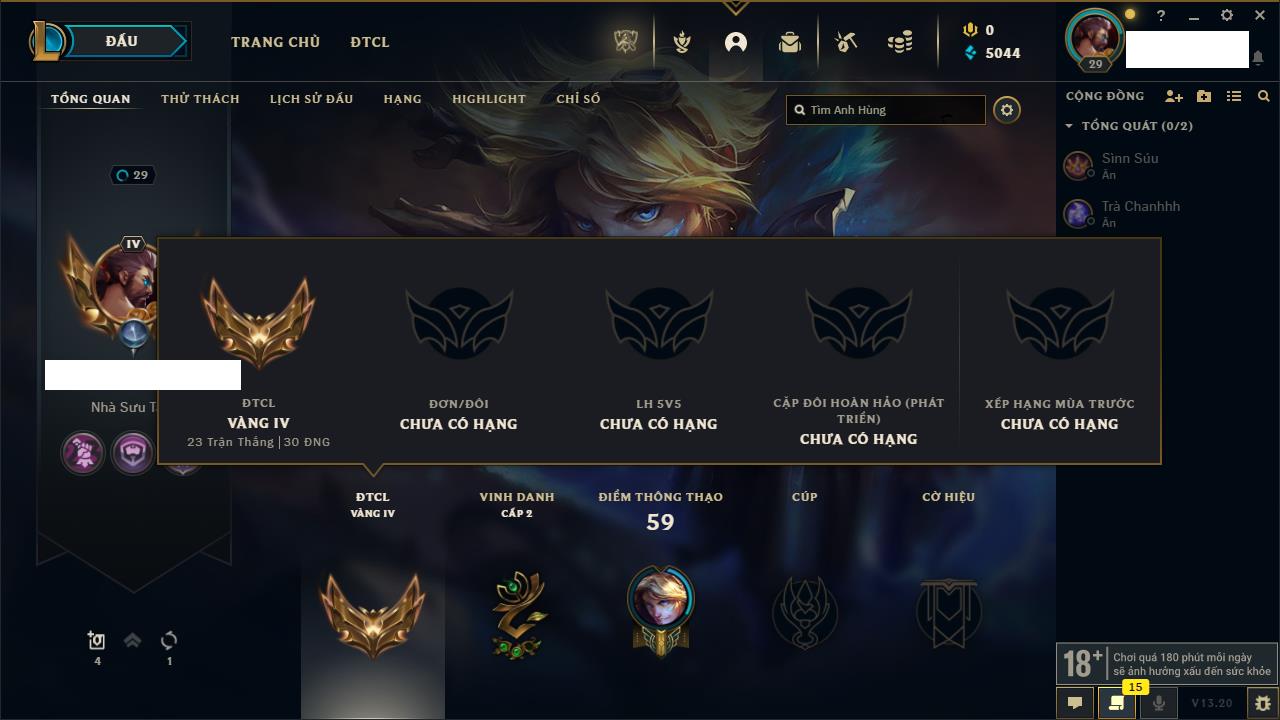 Rank Đơn: Chưa rank mùa nàoKhung: Chưa có khungTướng: 158 - Còn 6970 THXTrang Phục: 32Rank ĐTCL: Chưa RankLinh Thú: 24