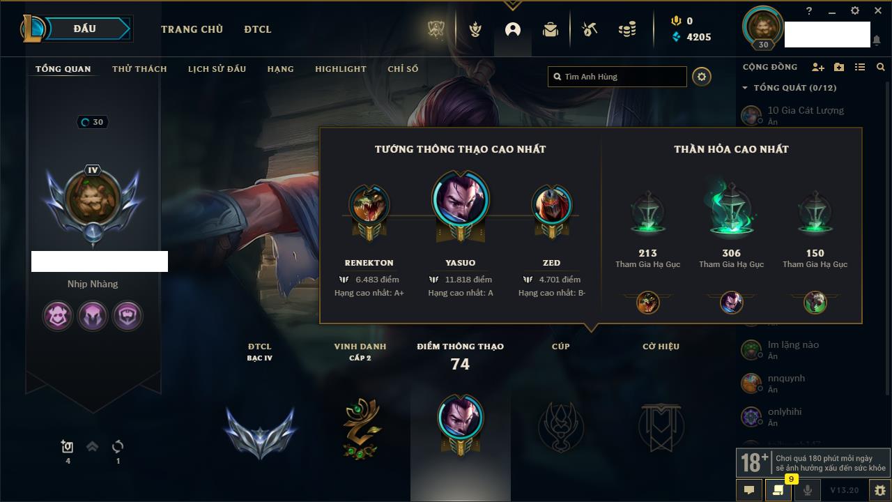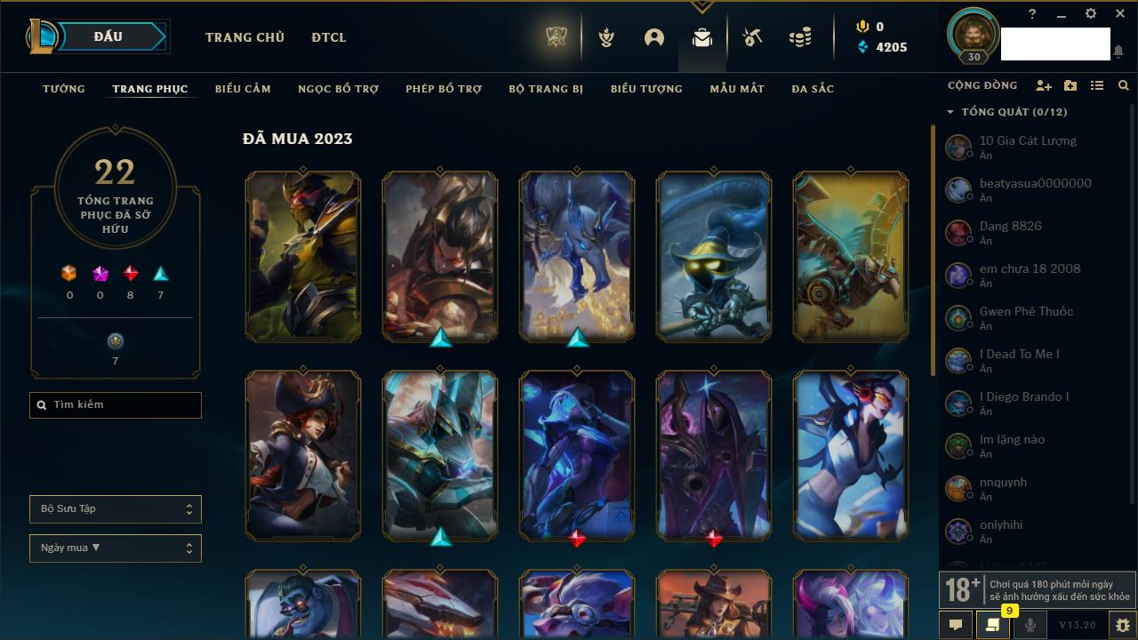 Rank Đơn: Chưa rank mùa nàoKhung: Chưa có khungTướng: 158 - Còn 6970 THXTrang Phục: 32Rank ĐTCL: Chưa RankLinh Thú: 24