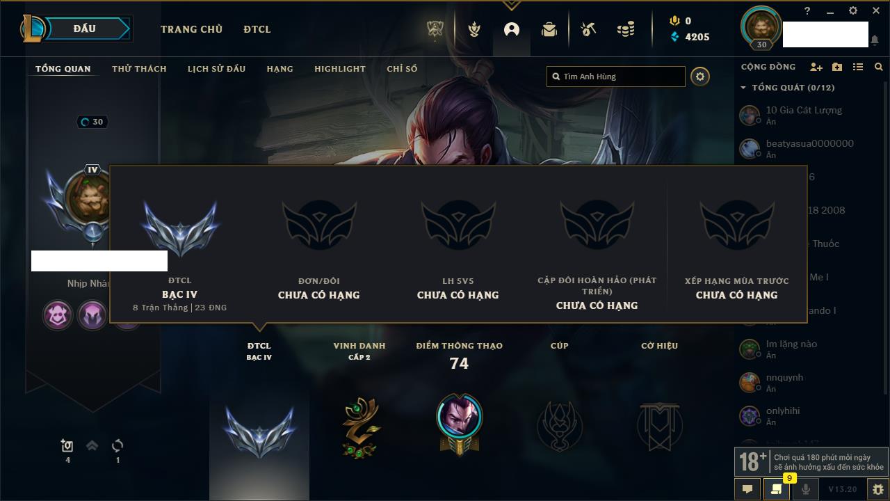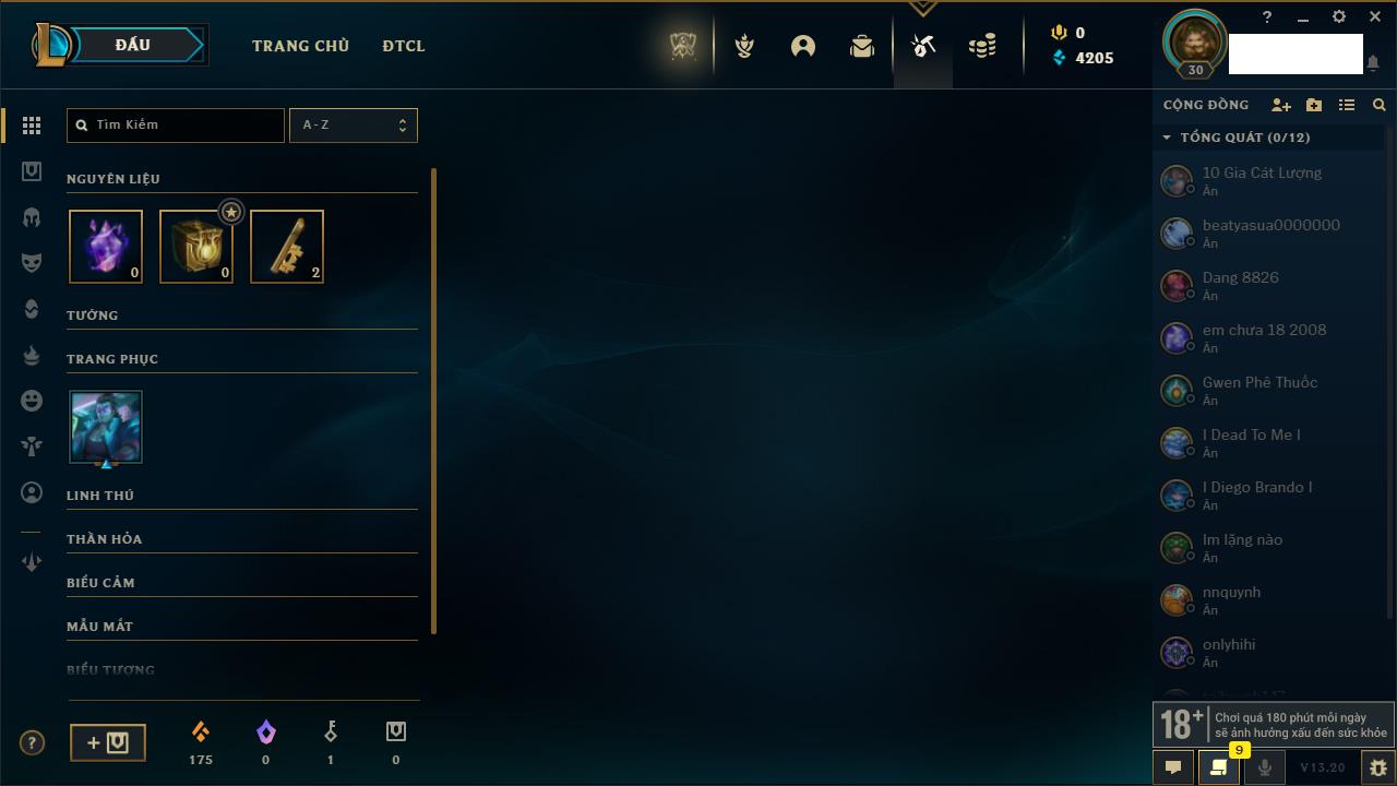 Rank Đơn: Chưa rank mùa nàoKhung: Chưa có khungTướng: 12 - Còn 3853 THXTrang Phục: 2Rank ĐTCL: Chưa RankLinh Thú: 30