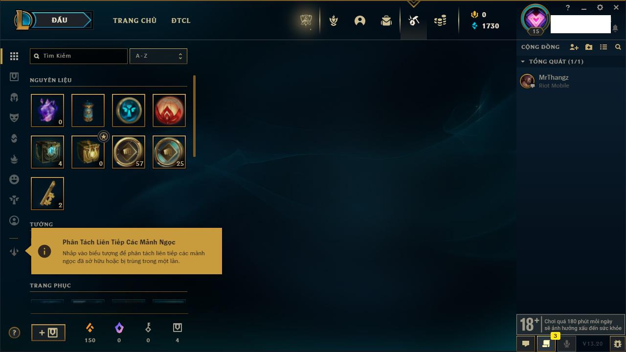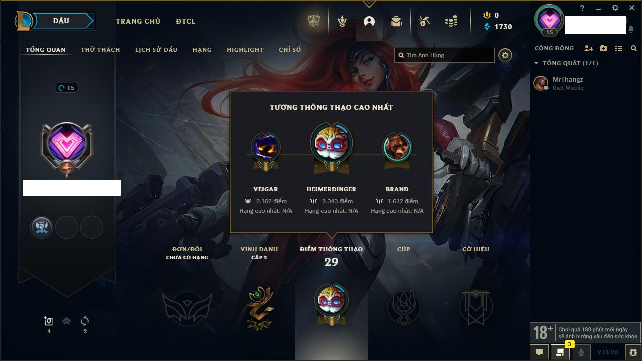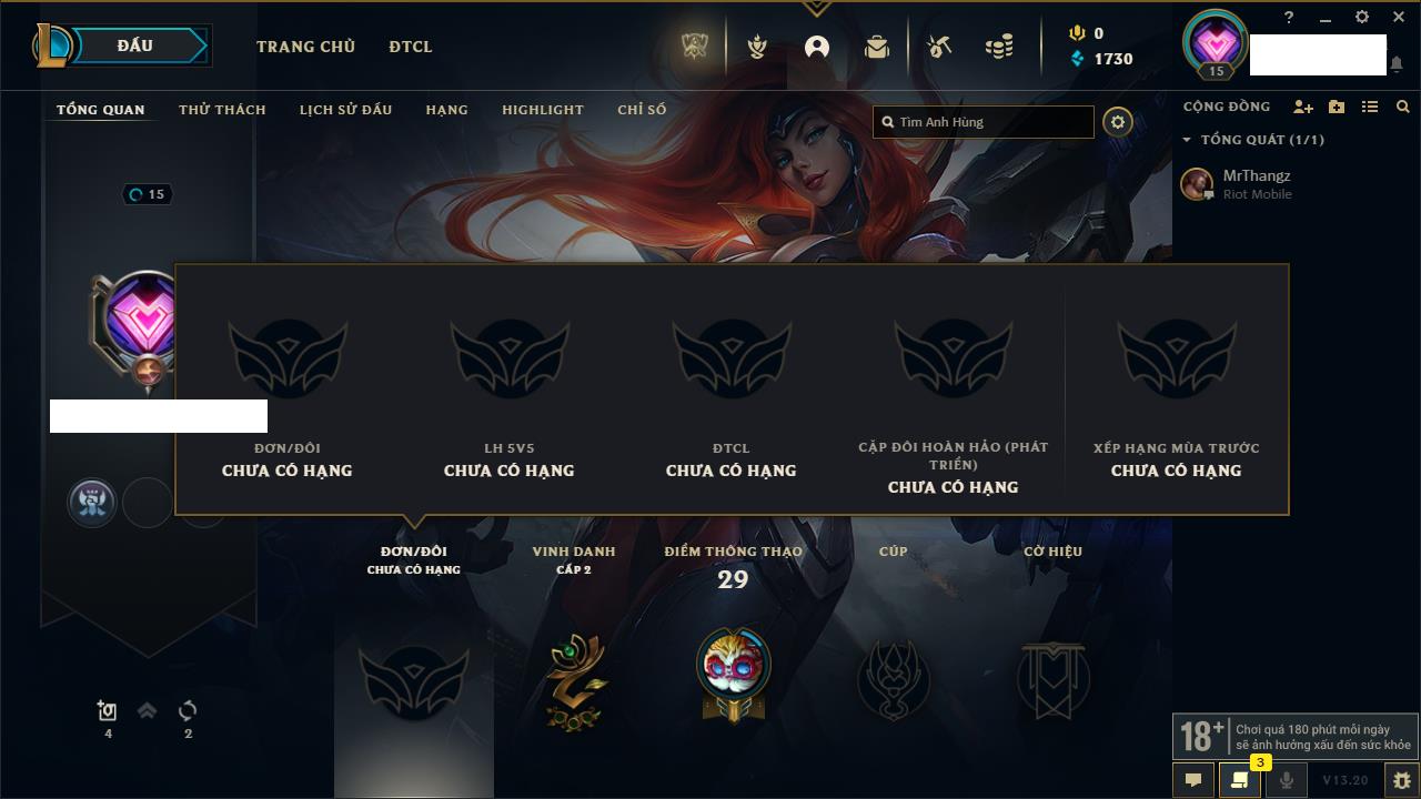 Rank Đơn: Chưa rank mùa nàoKhung: Chưa có khungTướng: 156 - Còn 18550 THXTrang Phục: 4Rank ĐTCL: Chưa RankLinh Thú: 75