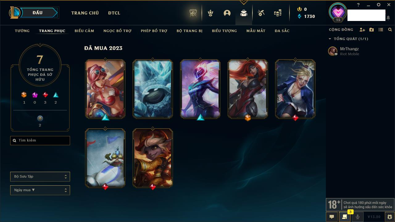 Rank Đơn: Chưa rank mùa nàoKhung: Chưa có khungTướng: 157 - Còn 2079 THXTrang Phục: 11Rank ĐTCL: Chưa RankLinh Thú: 70