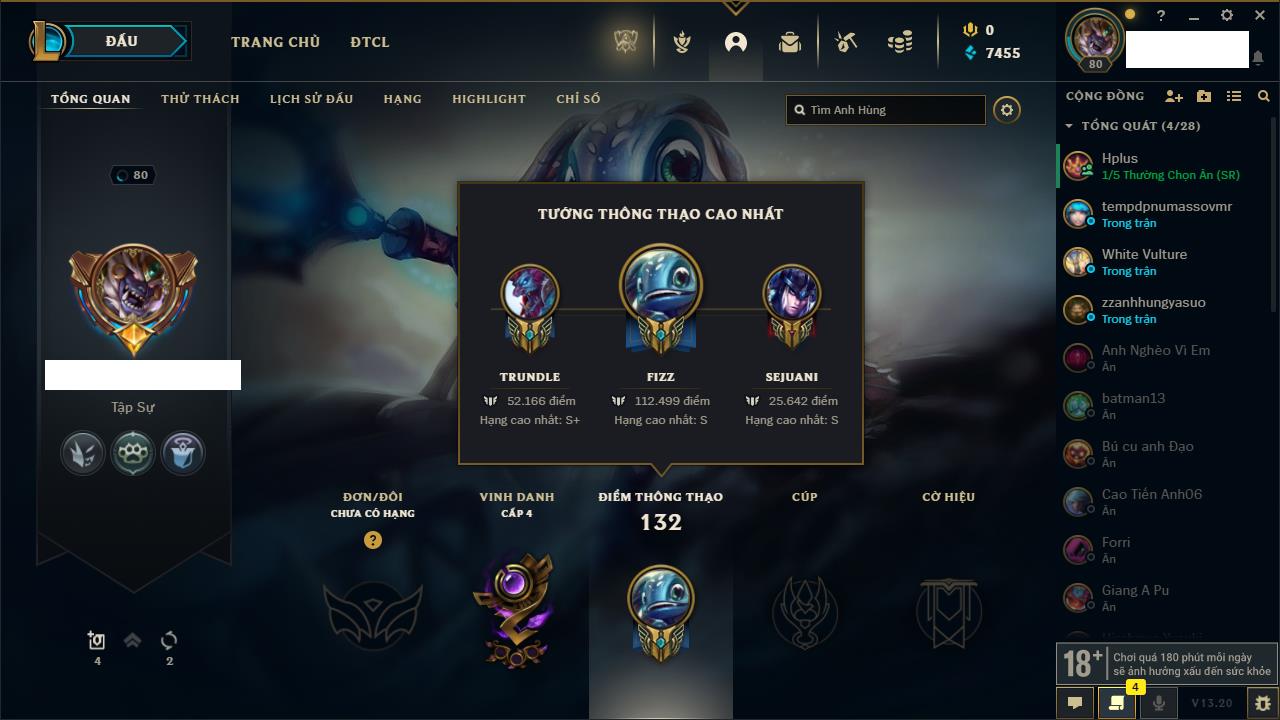 Rank Đơn: Chưa rank mùa nàoKhung: Chưa có khungTướng: 12 - Còn 3853 THXTrang Phục: 2Rank ĐTCL: Chưa RankLinh Thú: 30