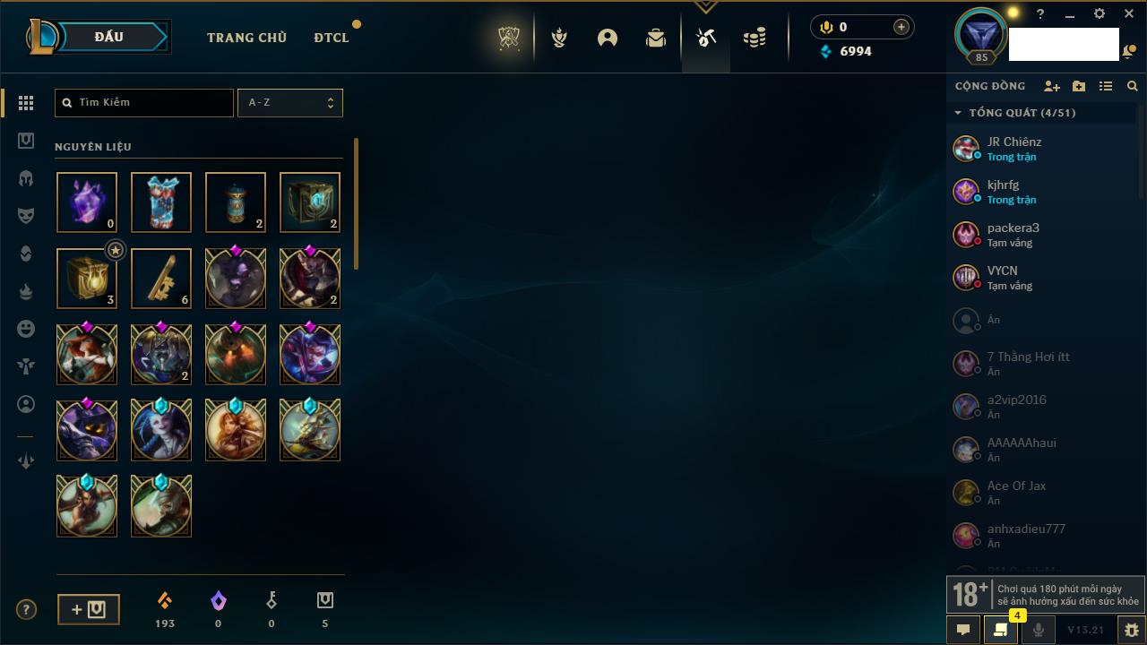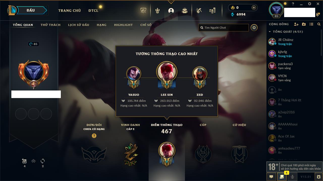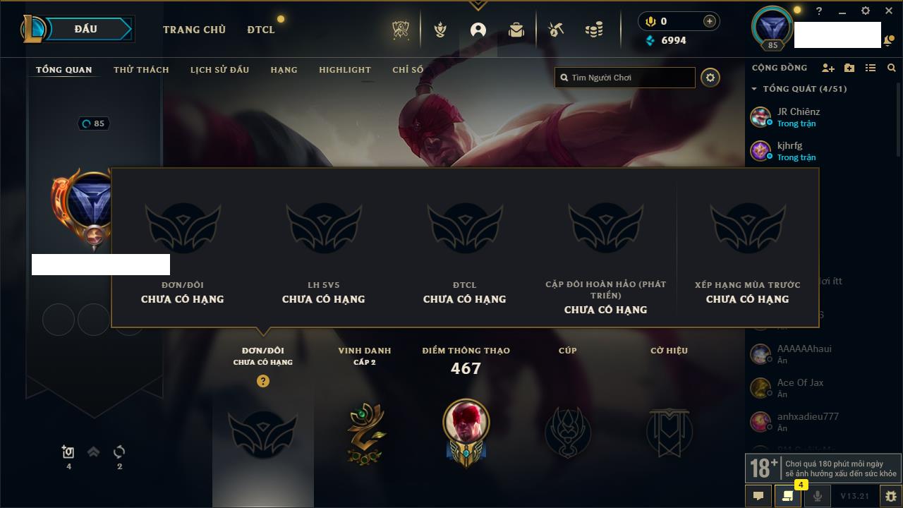 Rank Đơn: Chưa rank mùa nàoKhung: Chưa có khungTướng: 12 - Còn 3853 THXTrang Phục: 2Rank ĐTCL: Chưa RankLinh Thú: 30