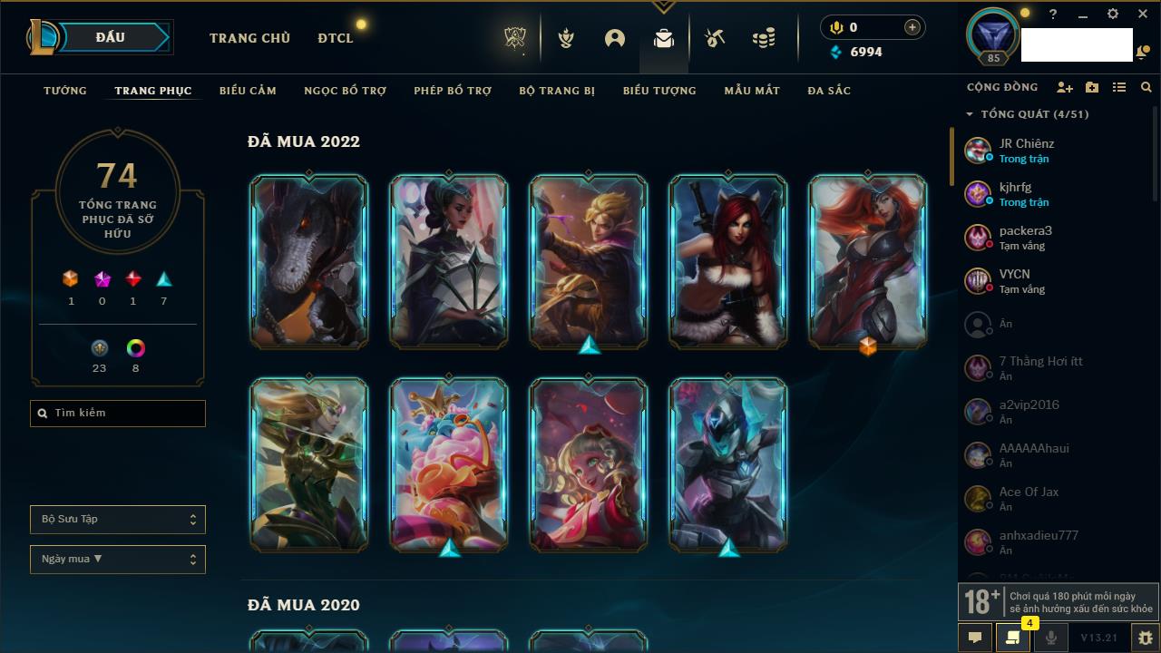 Rank Đơn: Chưa rank mùa nàoKhung: Chưa có khungTướng: 158 - Còn 6970 THXTrang Phục: 32Rank ĐTCL: Chưa RankLinh Thú: 24