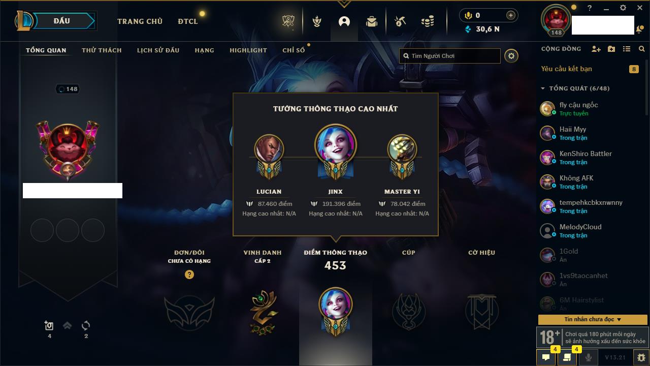 Rank Đơn: Chưa rank mùa nàoKhung: Chưa có khungTướng: 156 - Còn 18550 THXTrang Phục: 4Rank ĐTCL: Chưa RankLinh Thú: 75
