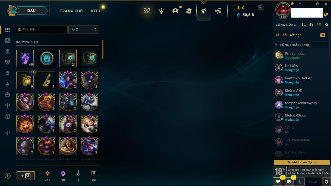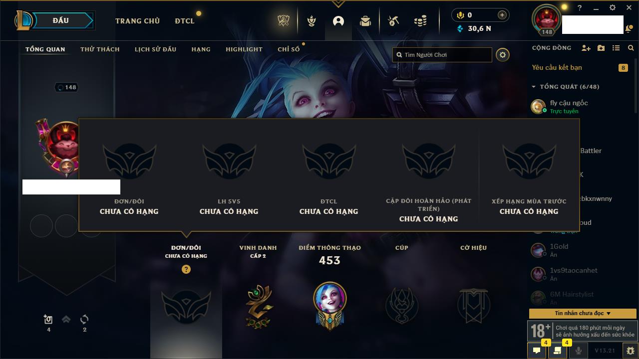 Rank Đơn: Chưa rank mùa nàoKhung: Chưa có khungTướng: 159 - Còn 15030 THXTrang Phục: 5Rank ĐTCL: Chưa RankLinh Thú: 51