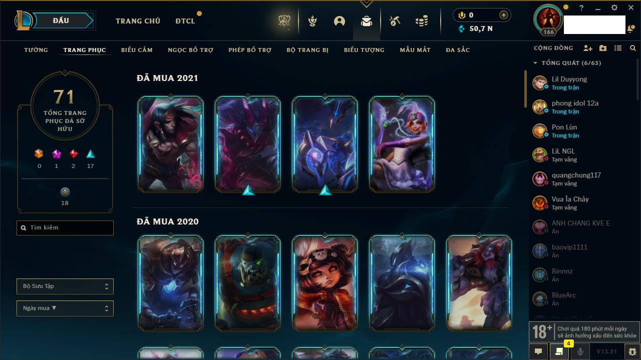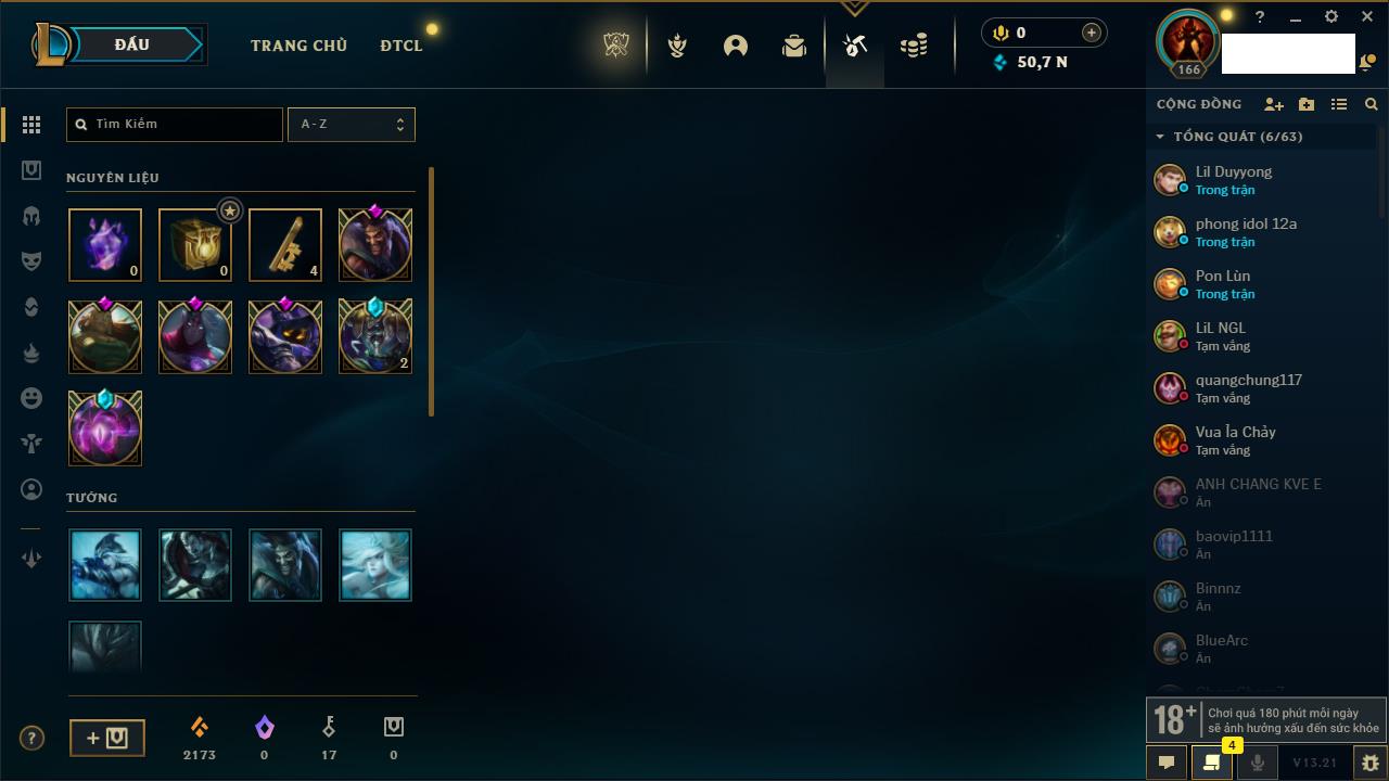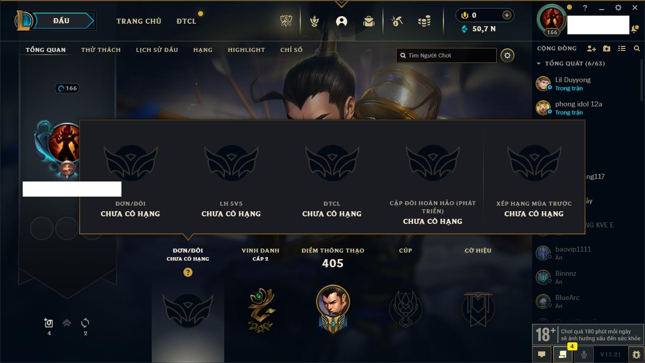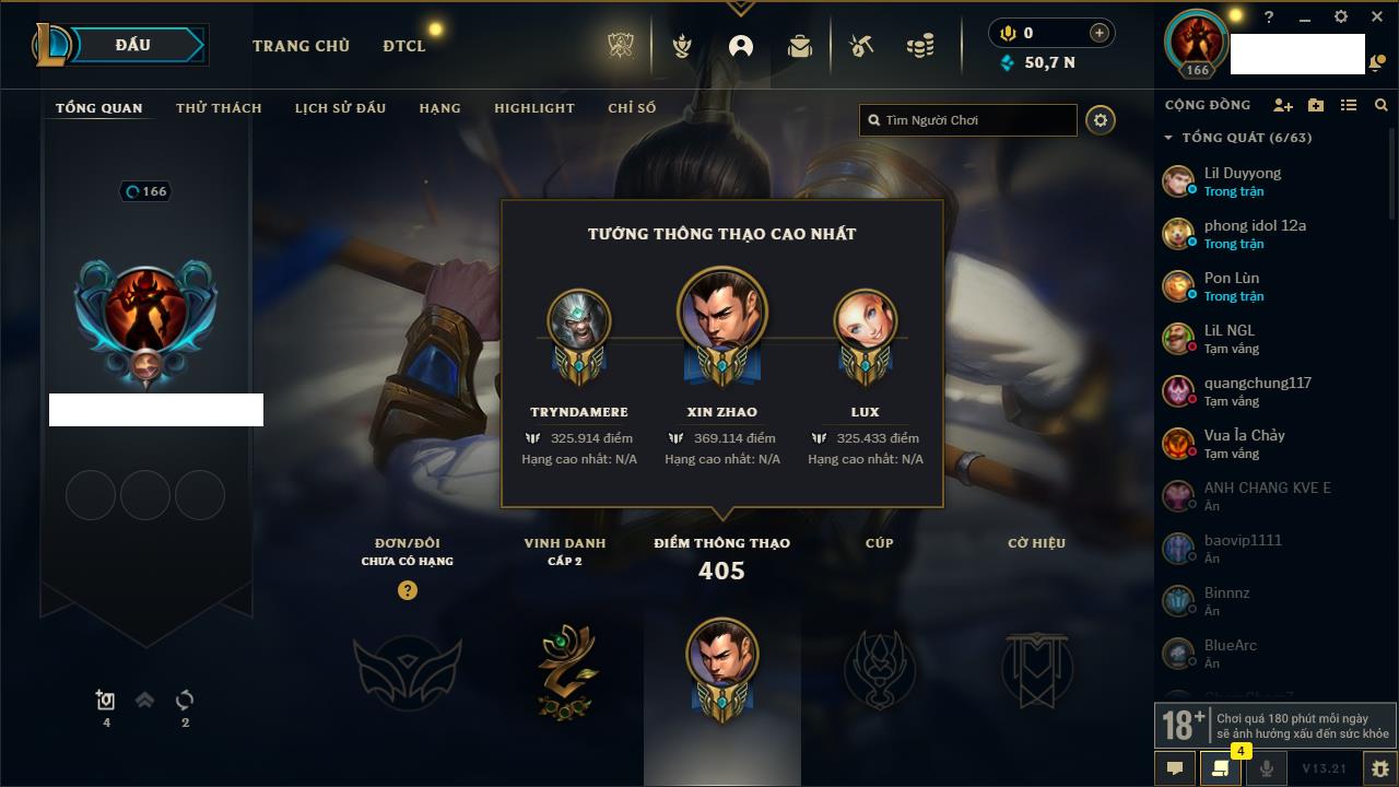 Rank Đơn: Chưa rank mùa nàoKhung: Chưa có khungTướng: 157 - Còn 20832 THXTrang Phục: 11Rank ĐTCL: Chưa RankLinh Thú: 79250.000 đ CARD 200.000 đ ATM