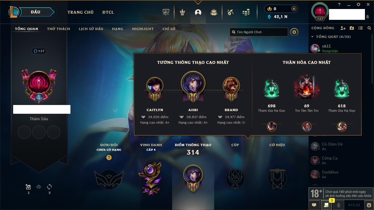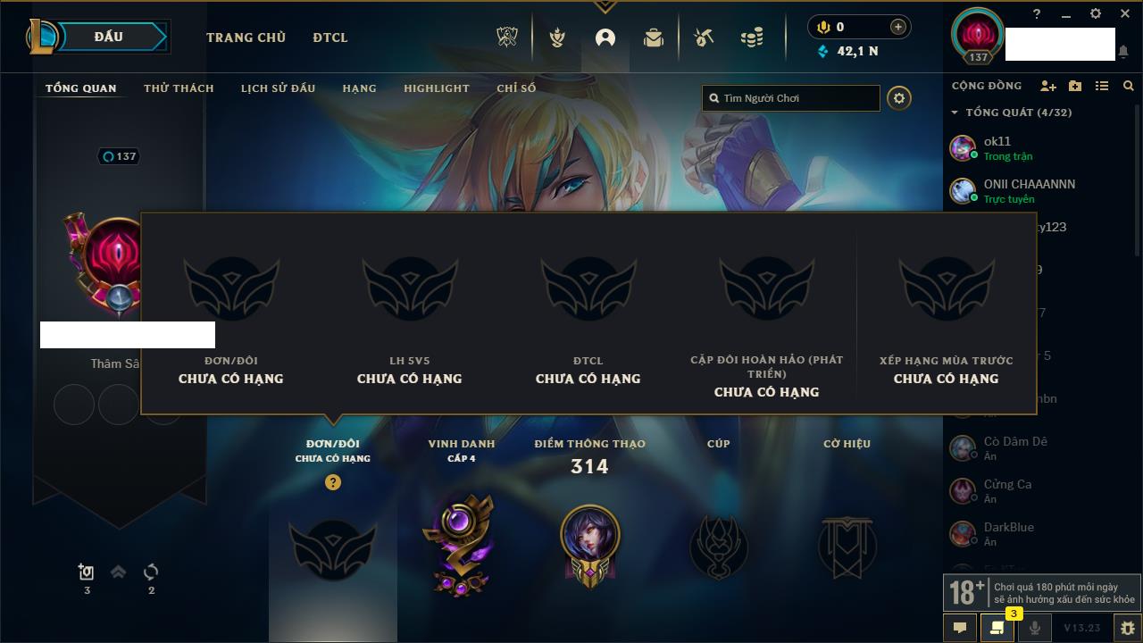 Rank Đơn: Chưa rank mùa nàoKhung: Chưa có khungTướng: 157 - Còn 12765 THXTrang Phục: 3Rank ĐTCL: Chưa RankLinh Thú: 78