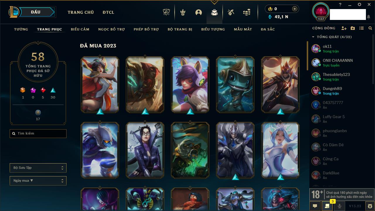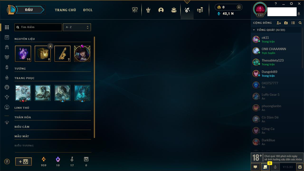 Rank Đơn: Chưa rank mùa nàoKhung: Chưa có khungTướng: 166 - Còn 3090 THXTrang Phục: 9Rank ĐTCL: Chưa RankLinh Thú: 125