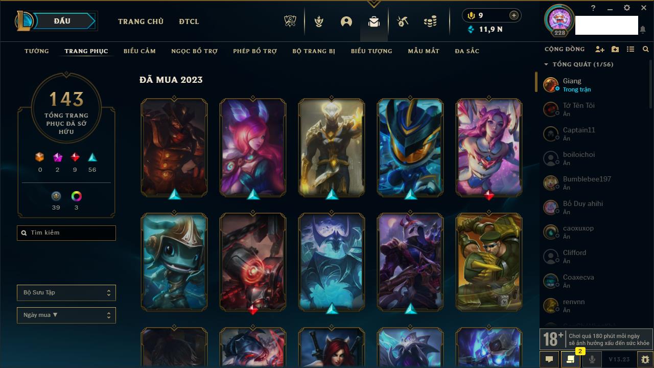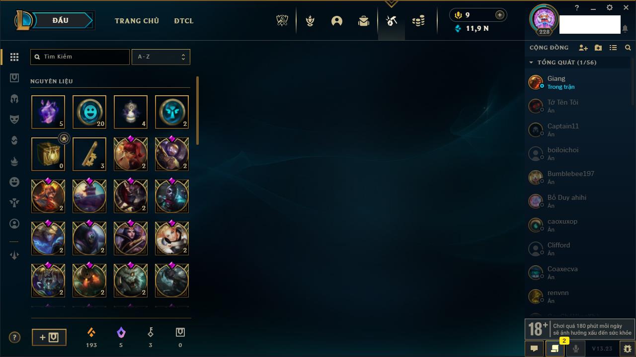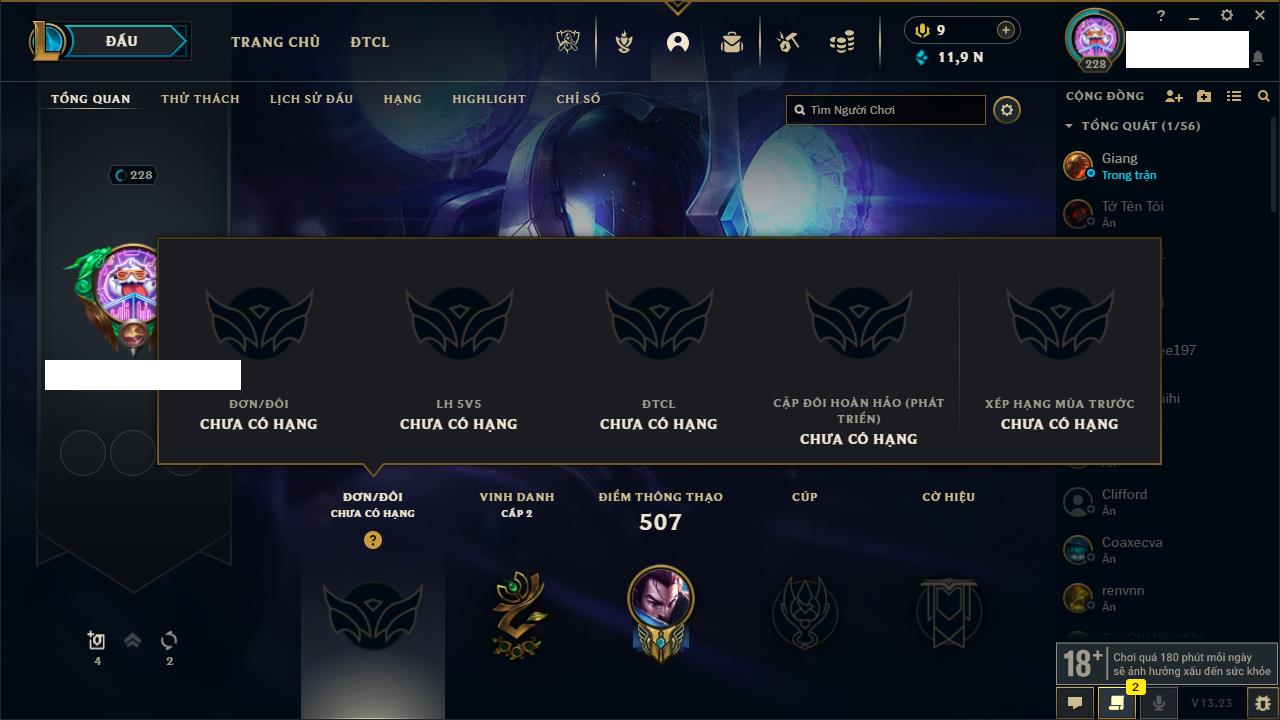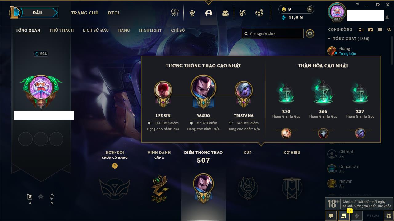 Rank Đơn: Đồng IIKhung: Chưa có khungTướng: 153 - Còn 32832 THXTrang Phục: 66Rank ĐTCL: Chưa RankLinh Thú: 7