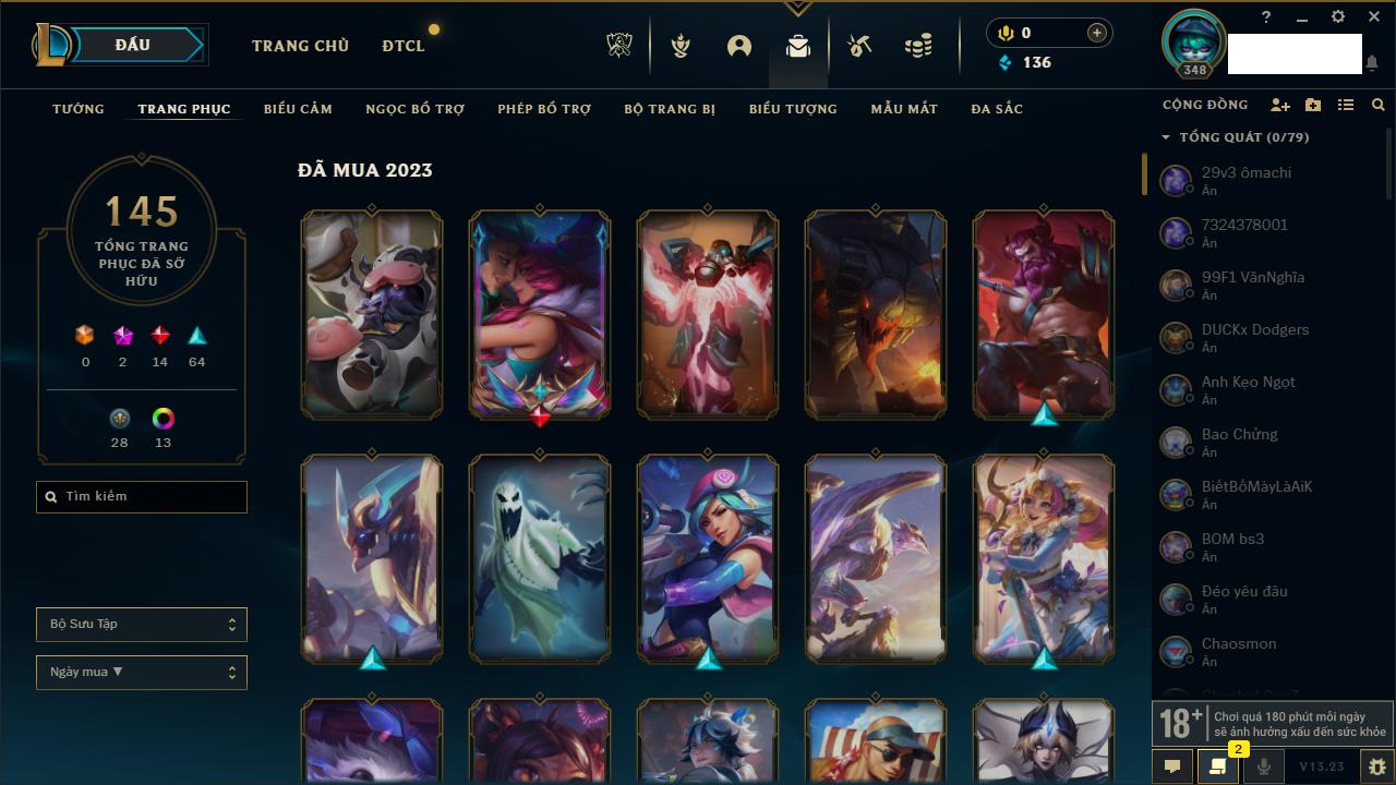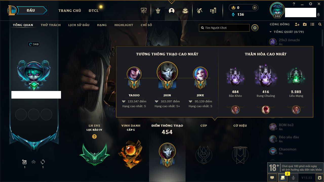 Rank Đơn: Chưa RankKhung: Chưa có khungTướng: 148 - Còn 2211 THXTrang Phục: 97Rank ĐTCL: Chưa RankLinh Thú: 77
