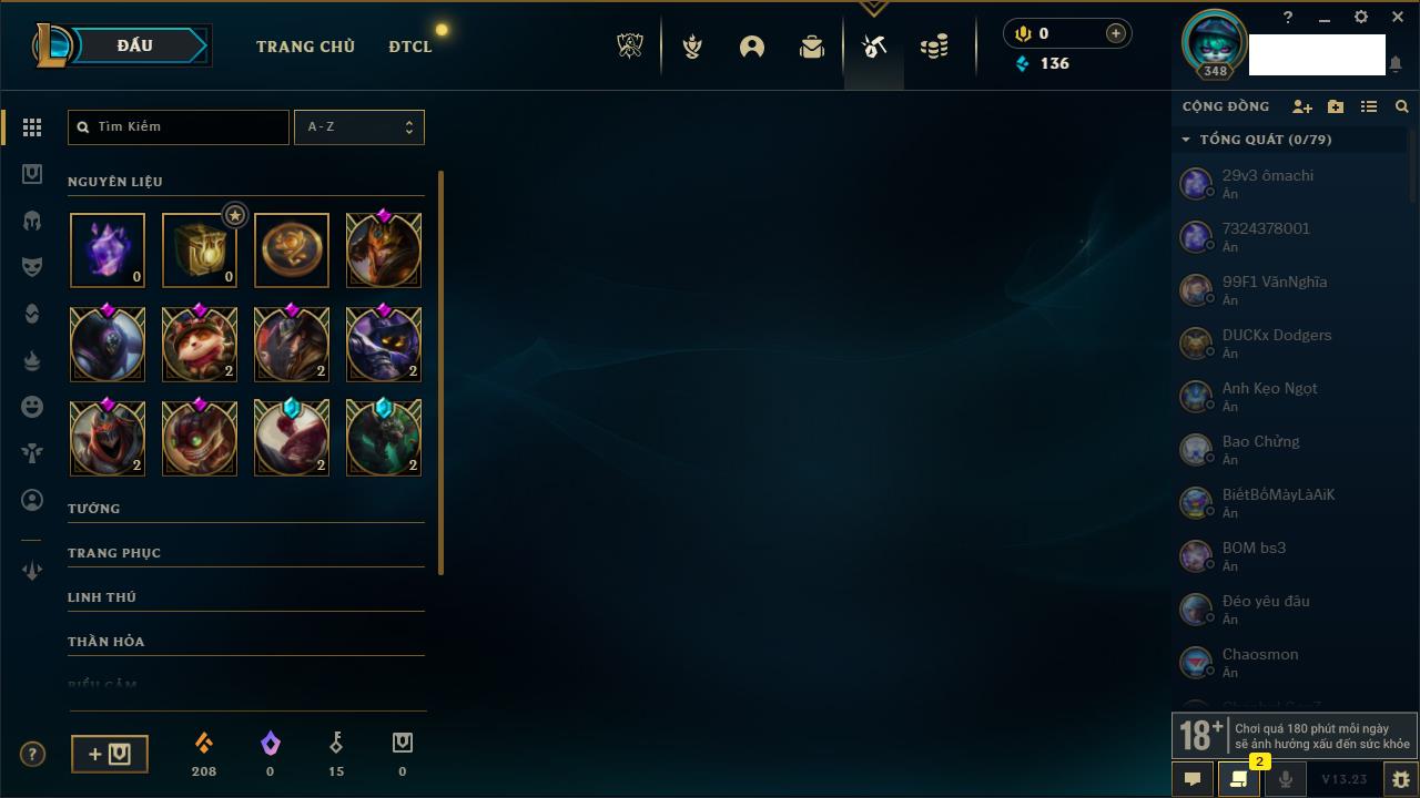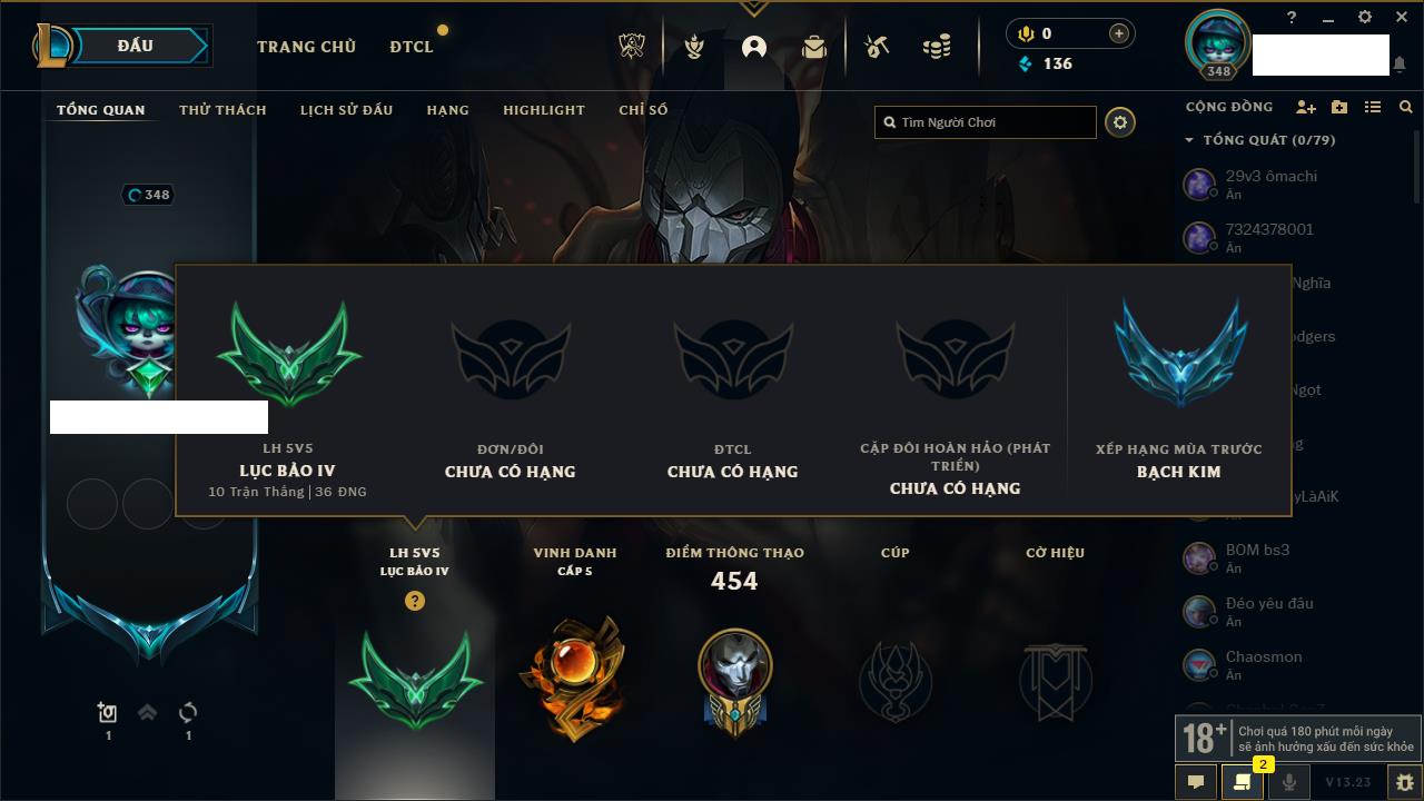 Rank Đơn: Chưa RankKhung: VàngTướng: 170 - Còn 37719 THXTrang Phục: 138Rank ĐTCL: Chưa RankLinh Thú: 65