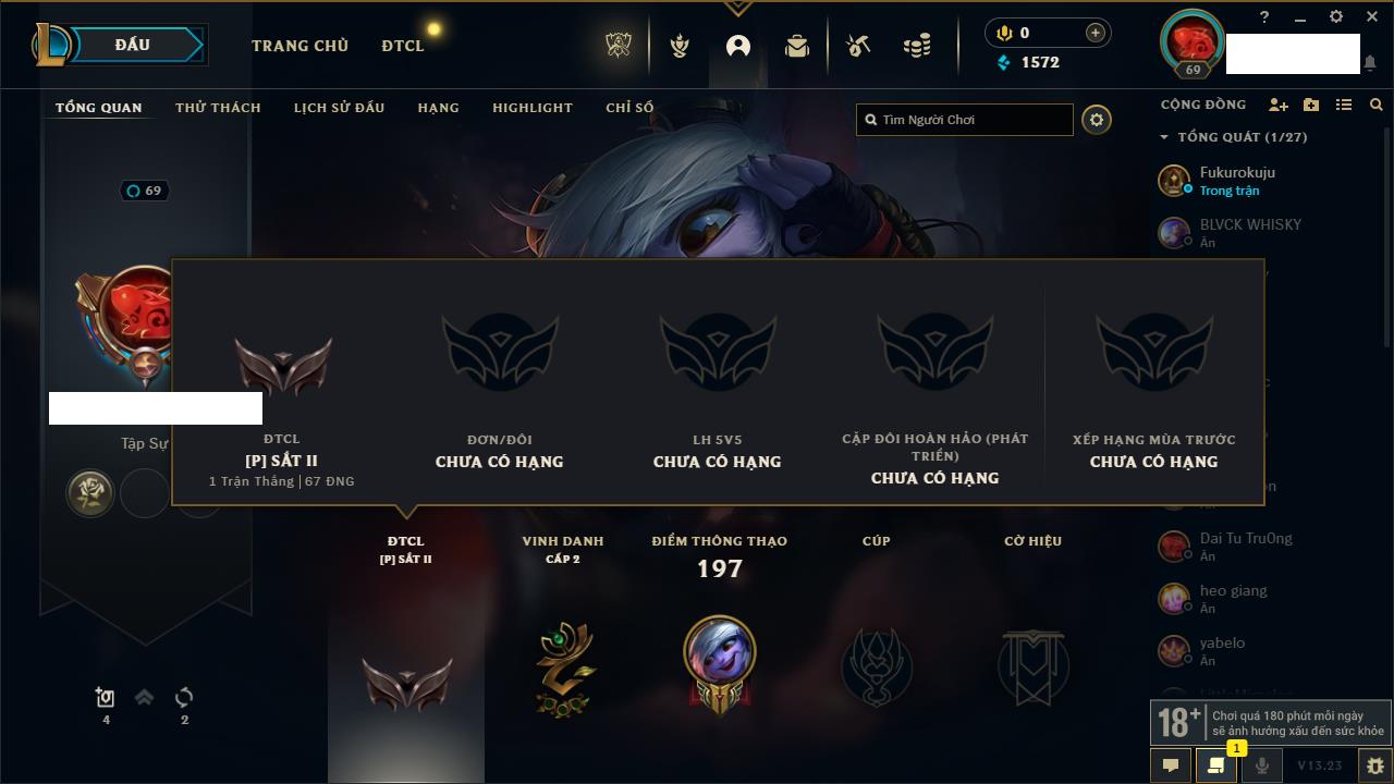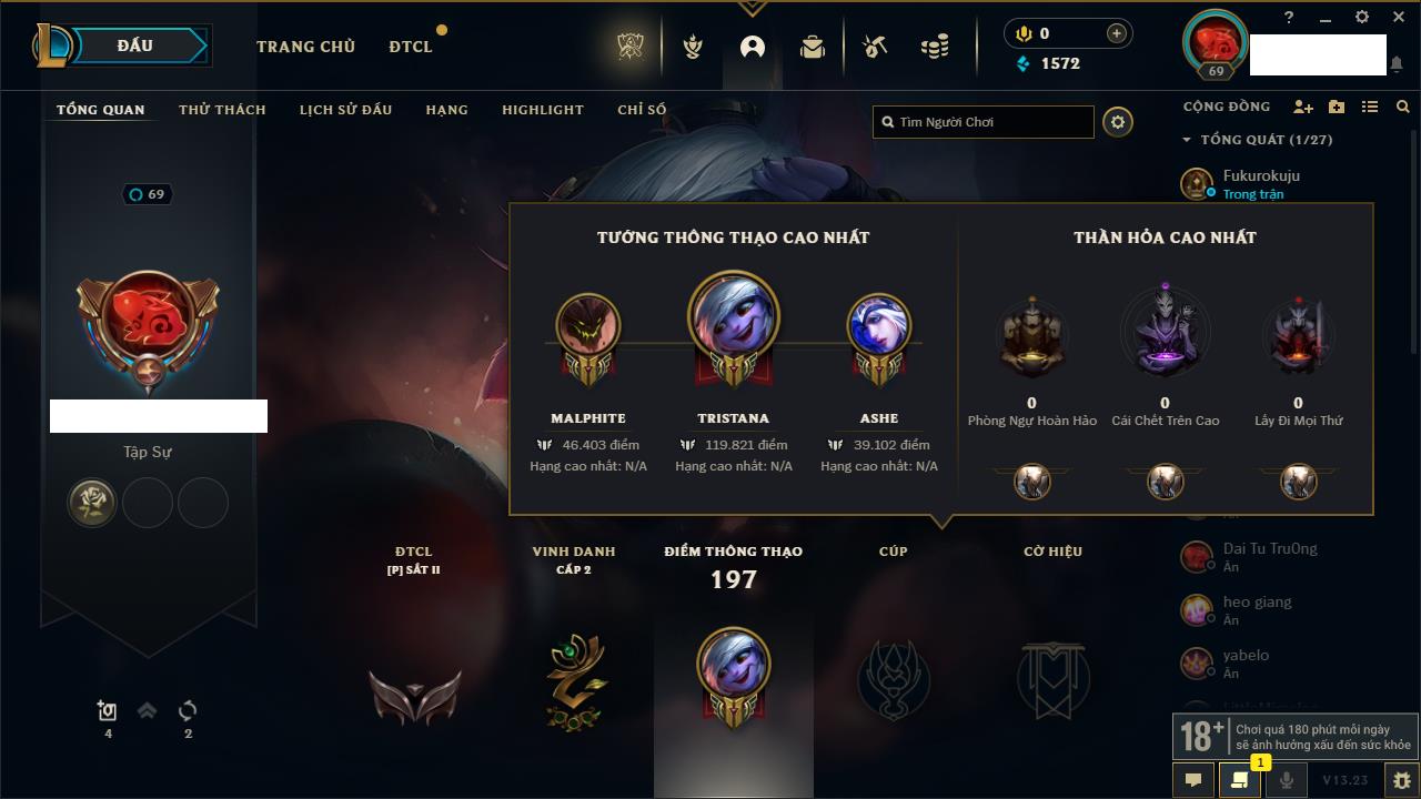 Rank Đơn: Chưa rank mùa nàoKhung: Chưa có khungTướng: 36 - Còn 190 THXTrang Phục: 14Rank ĐTCL: Chưa RankLinh Thú: 65