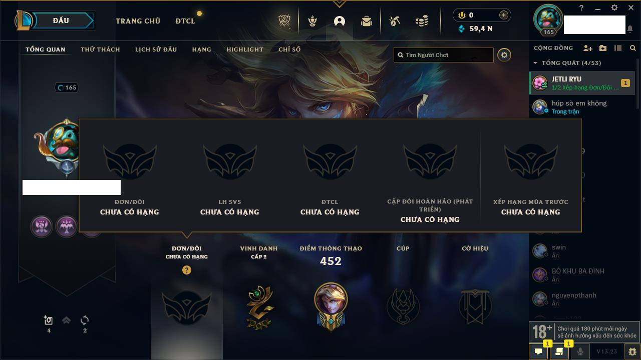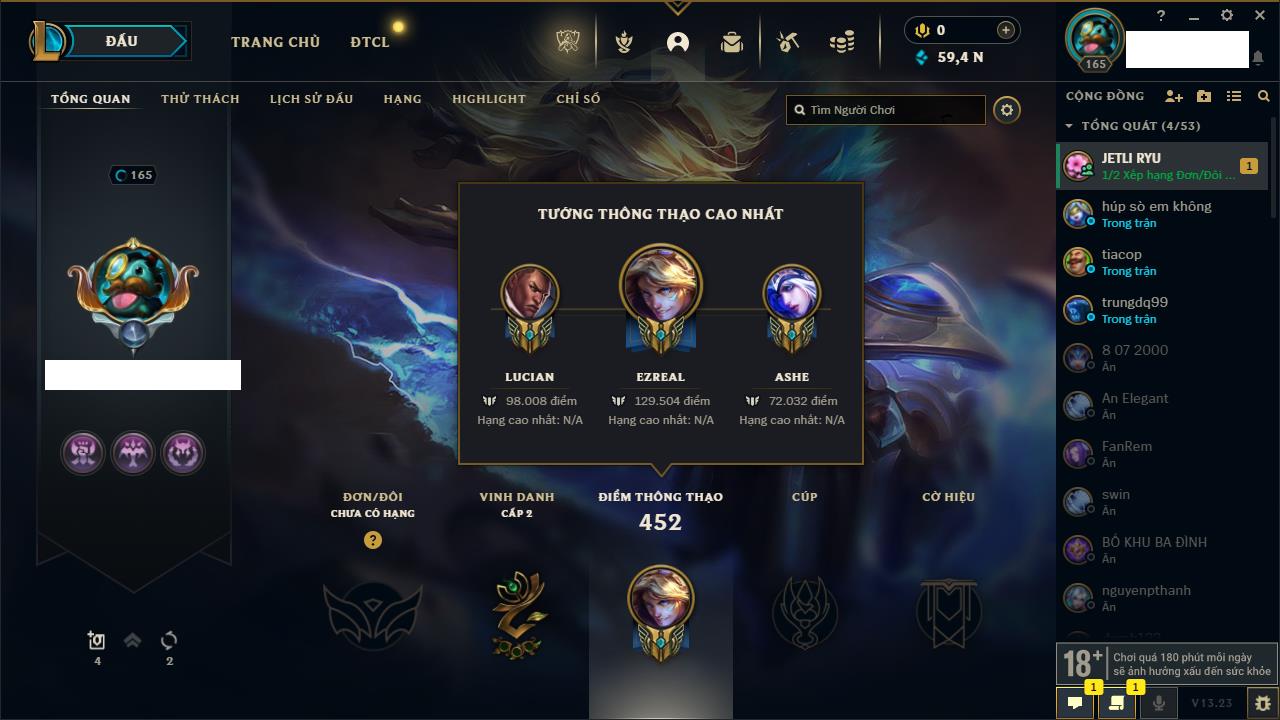 Rank Đơn: Chưa RankKhung: VàngTướng: 172 - Còn 155977 THXTrang Phục: 199Rank ĐTCL: Chưa RankLinh Thú: 108
