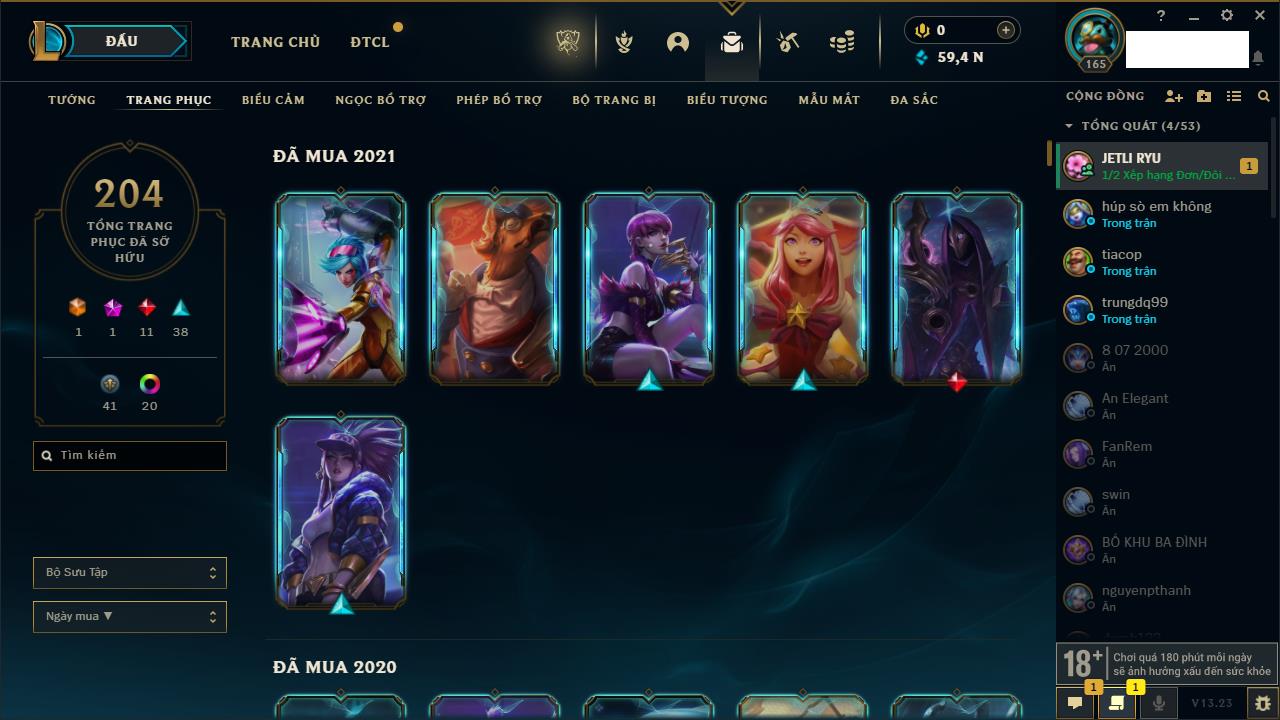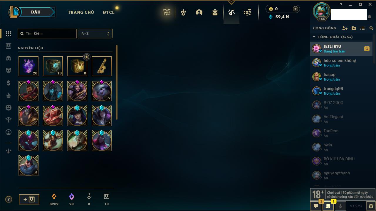Rank Đơn: Bạc IIKhung: VàngTướng: 171 - Còn 48568 THXTrang Phục: 121Rank ĐTCL: Chưa RankLinh Thú: 30