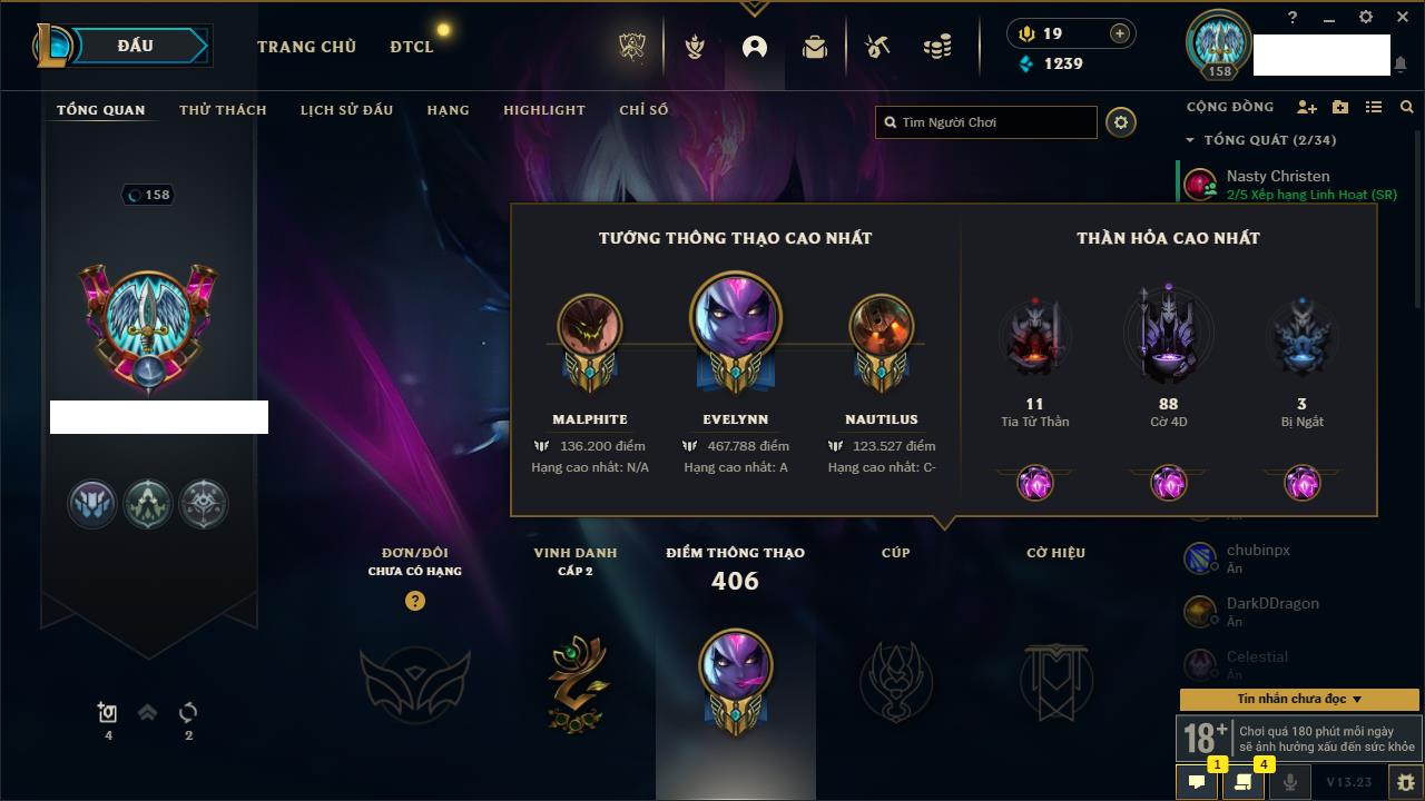 Rank Đơn: Chưa rank mùa nàoKhung: Chưa có khungTướng: 156 - Còn 18550 THXTrang Phục: 4Rank ĐTCL: Chưa RankLinh Thú: 75