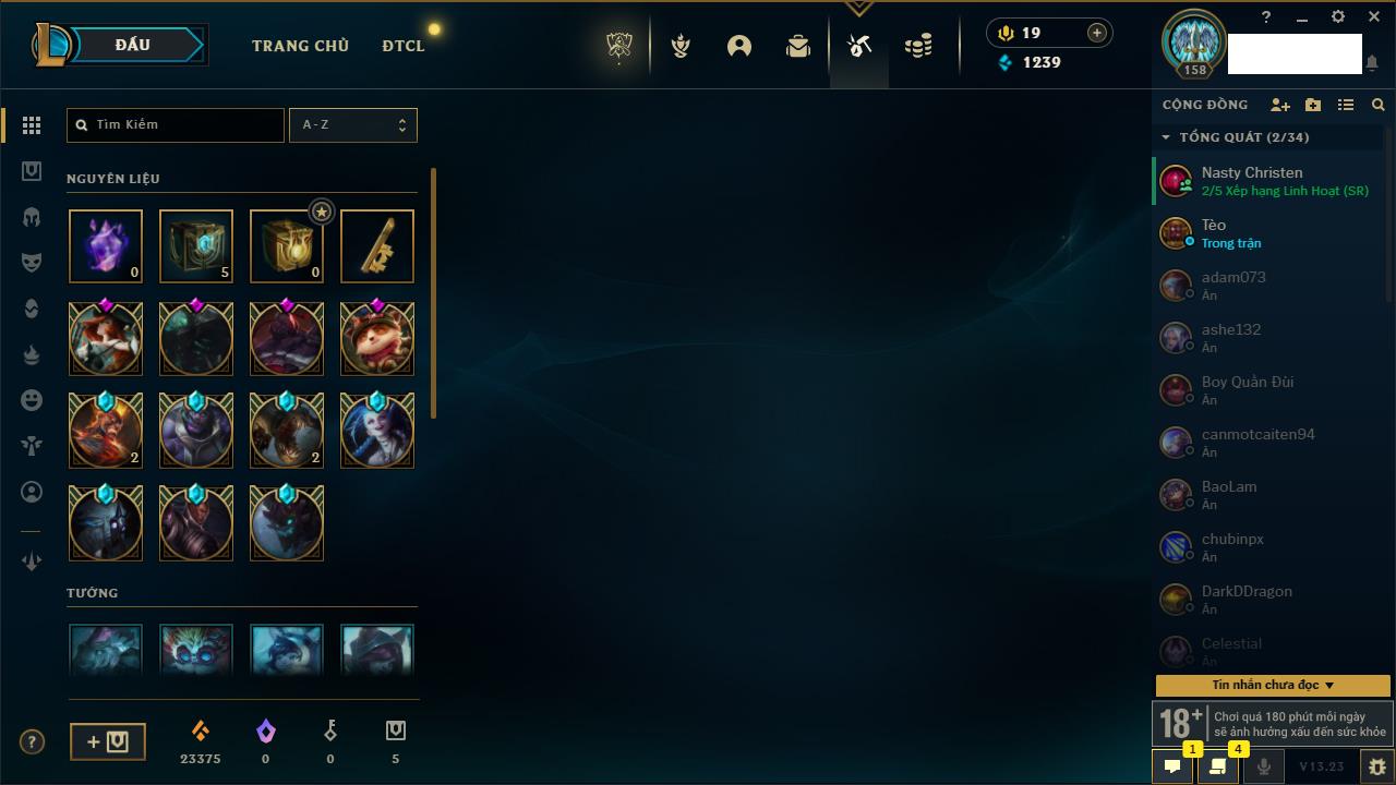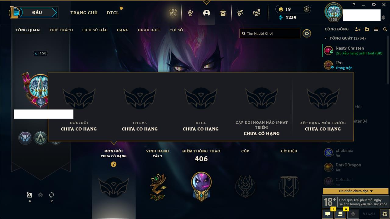 Rank Đơn: Chưa rank mùa nàoKhung: Chưa có khungTướng: 159 - Còn 15030 THXTrang Phục: 5Rank ĐTCL: Chưa RankLinh Thú: 51