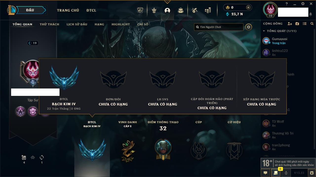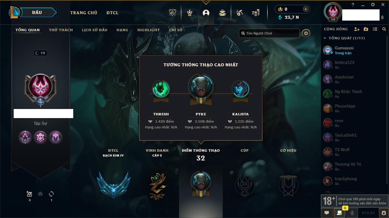 Rank Đơn: Chưa rank mùa nàoKhung: Chưa có khungTướng: 156 - Còn 18550 THXTrang Phục: 4Rank ĐTCL: Chưa RankLinh Thú: 75