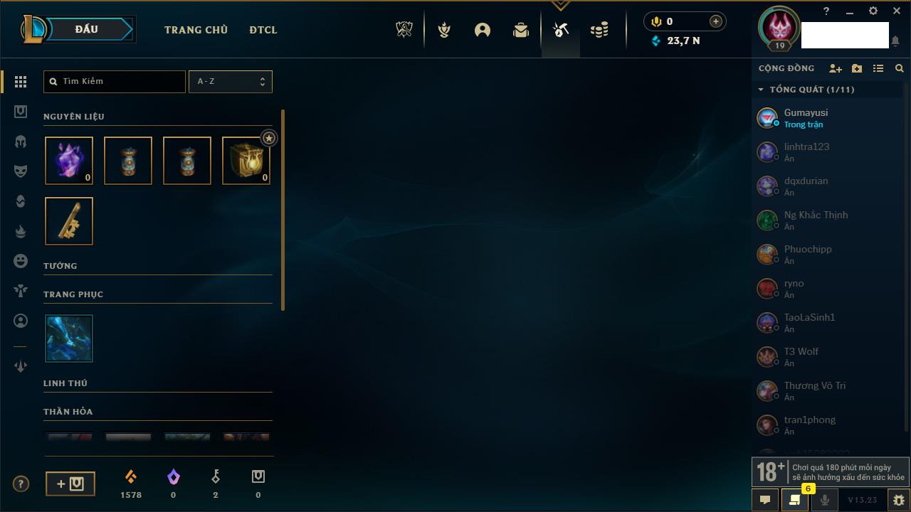 Rank Đơn: Chưa rank mùa nàoKhung: Chưa có khungTướng: 157 - Còn 8409 THXTrang Phục: 12Rank ĐTCL: Chưa RankLinh Thú: 74