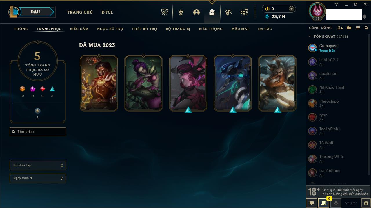 Rank Đơn: Chưa rank mùa nàoKhung: Chưa có khungTướng: 161 - Còn 11380 THXTrang Phục: 13Rank ĐTCL: Chưa RankLinh Thú: 74