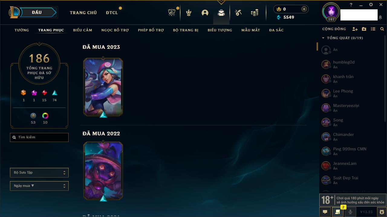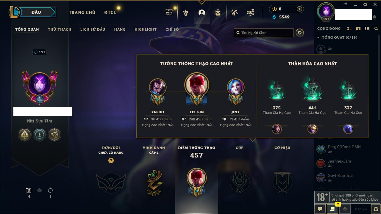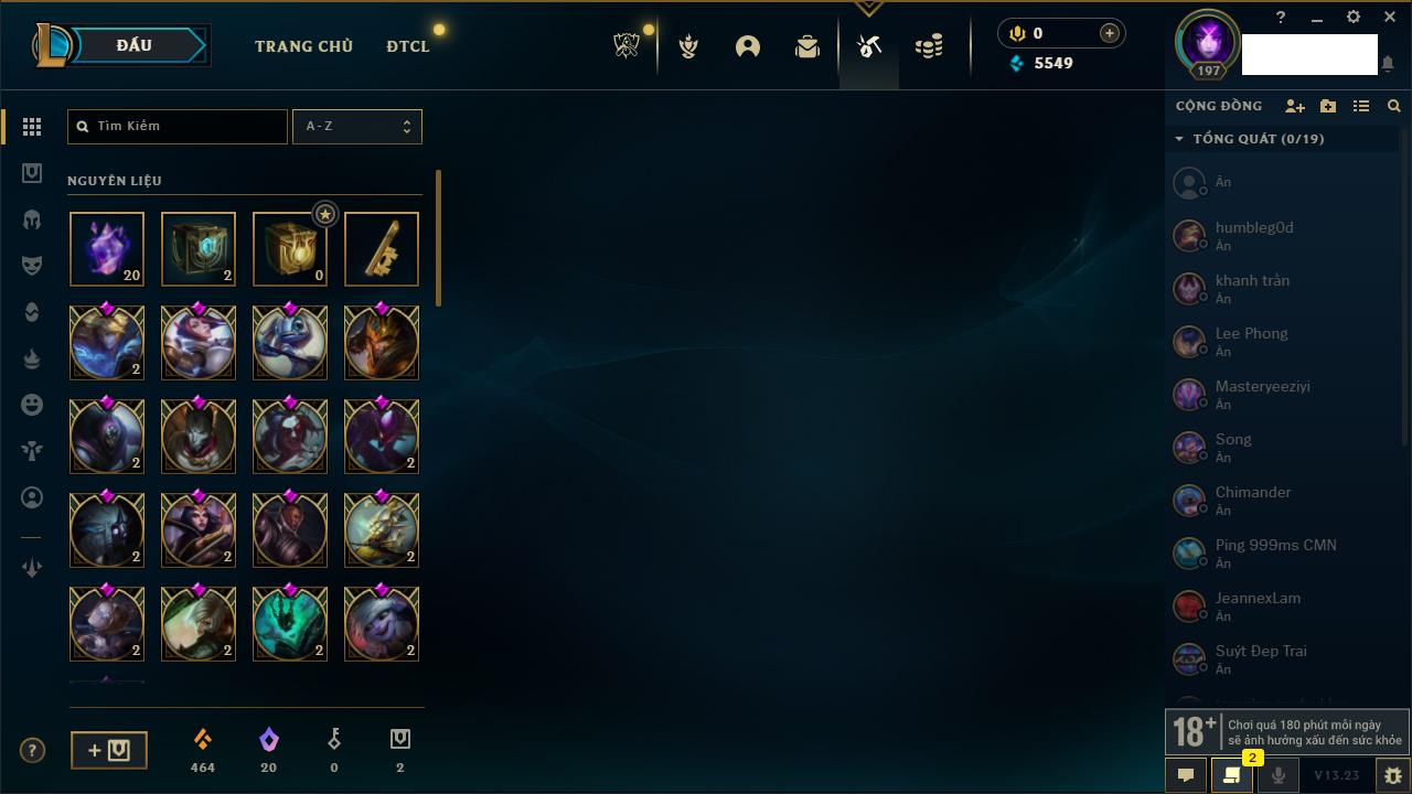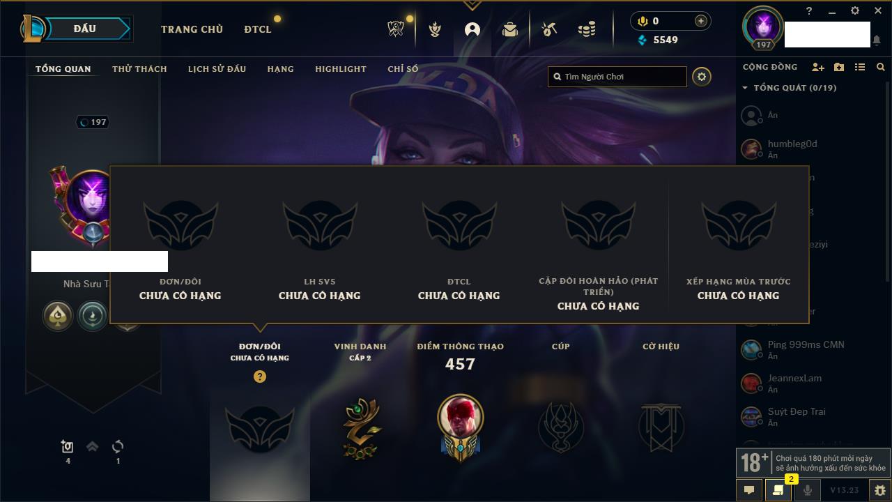 Rank Đơn: Chưa RankKhung: Chưa có khungTướng: 157 - Còn 6783 THXTrang Phục: 50Rank ĐTCL: Chưa RankLinh Thú: 37