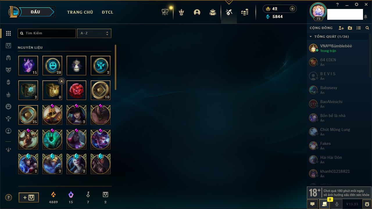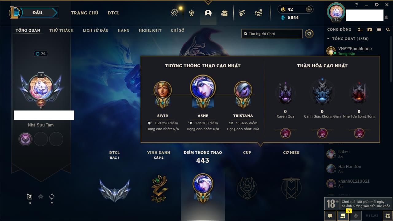 Rank Đơn: Bạc IVKhung: VàngTướng: 172 - Còn 358384 THXTrang Phục: 177Rank ĐTCL: Lục Bảo IILinh Thú: 211