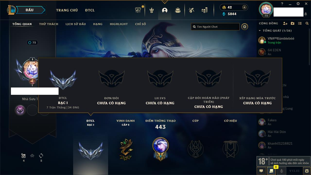 Rank Đơn: Bạc IIKhung: VàngTướng: 171 - Còn 332462 THXTrang Phục: 165Rank ĐTCL: Kim Cương IVLinh Thú: 181