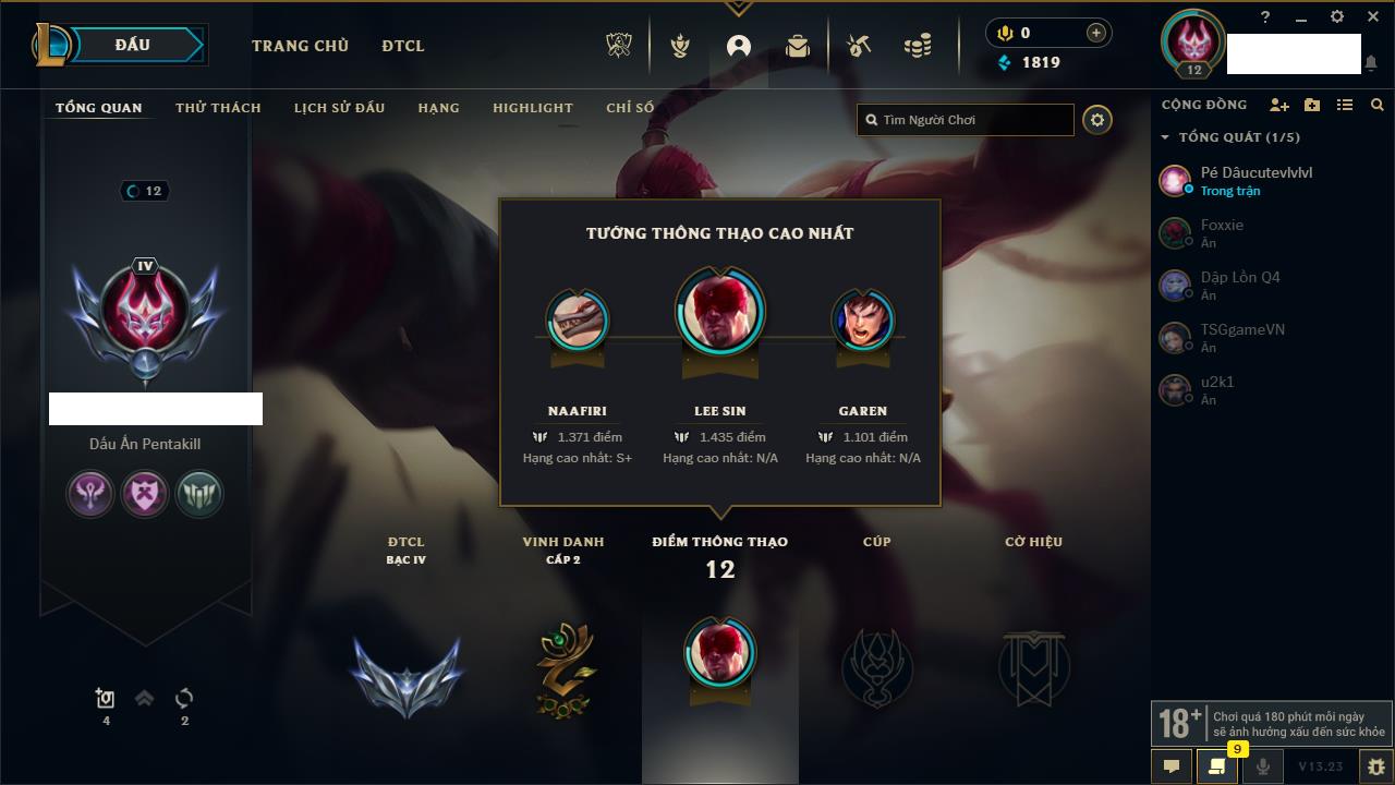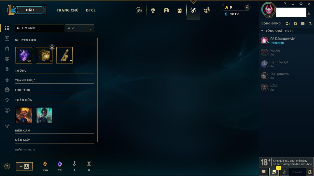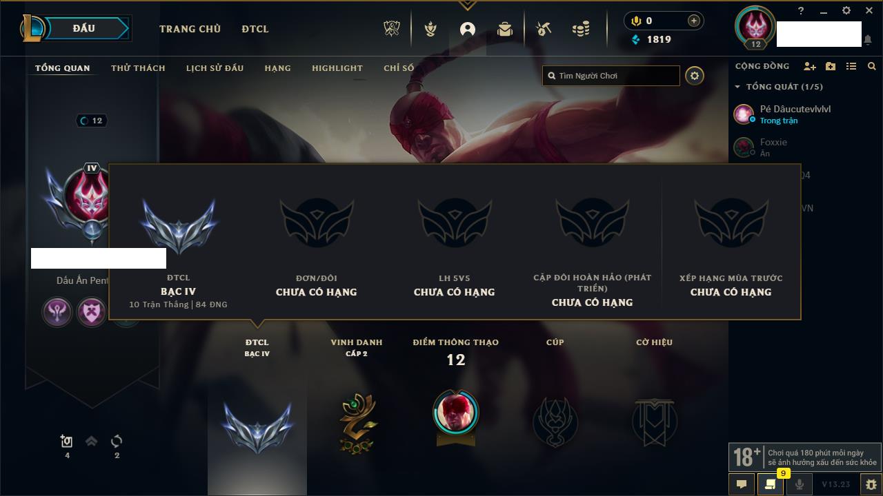 Rank Đơn: Chưa rank mùa nàoKhung: Chưa có khungTướng: 156 - Còn 18550 THXTrang Phục: 4Rank ĐTCL: Chưa RankLinh Thú: 75