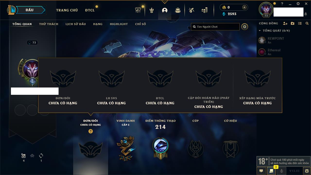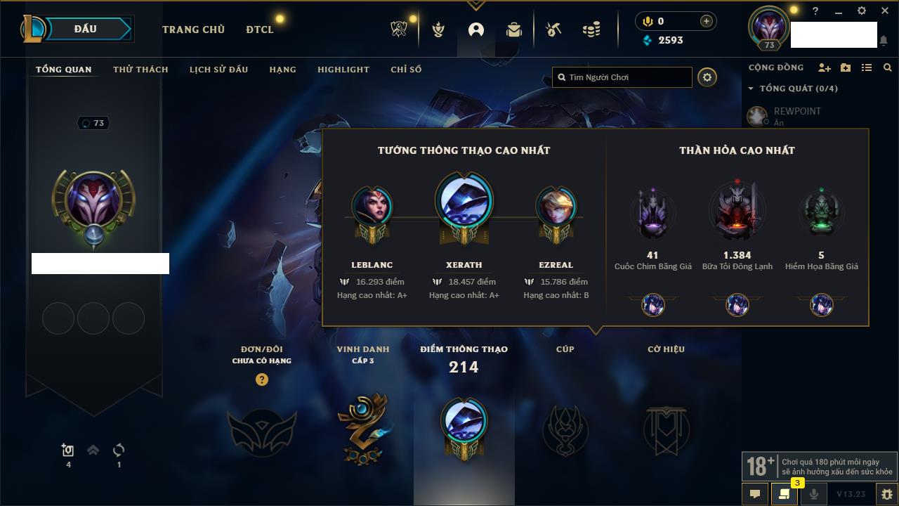Rank Đơn: Chưa rank mùa nàoKhung: Chưa có khungTướng: 12 - Còn 3853 THXTrang Phục: 2Rank ĐTCL: Chưa RankLinh Thú: 30
