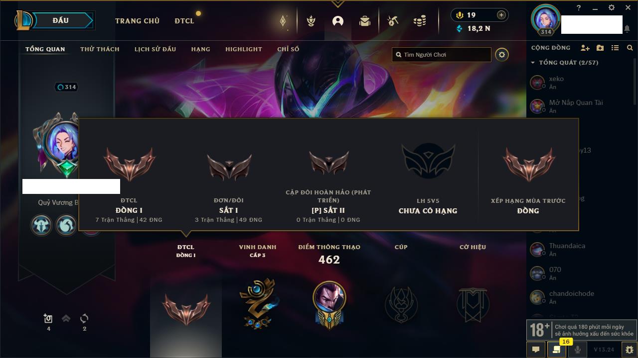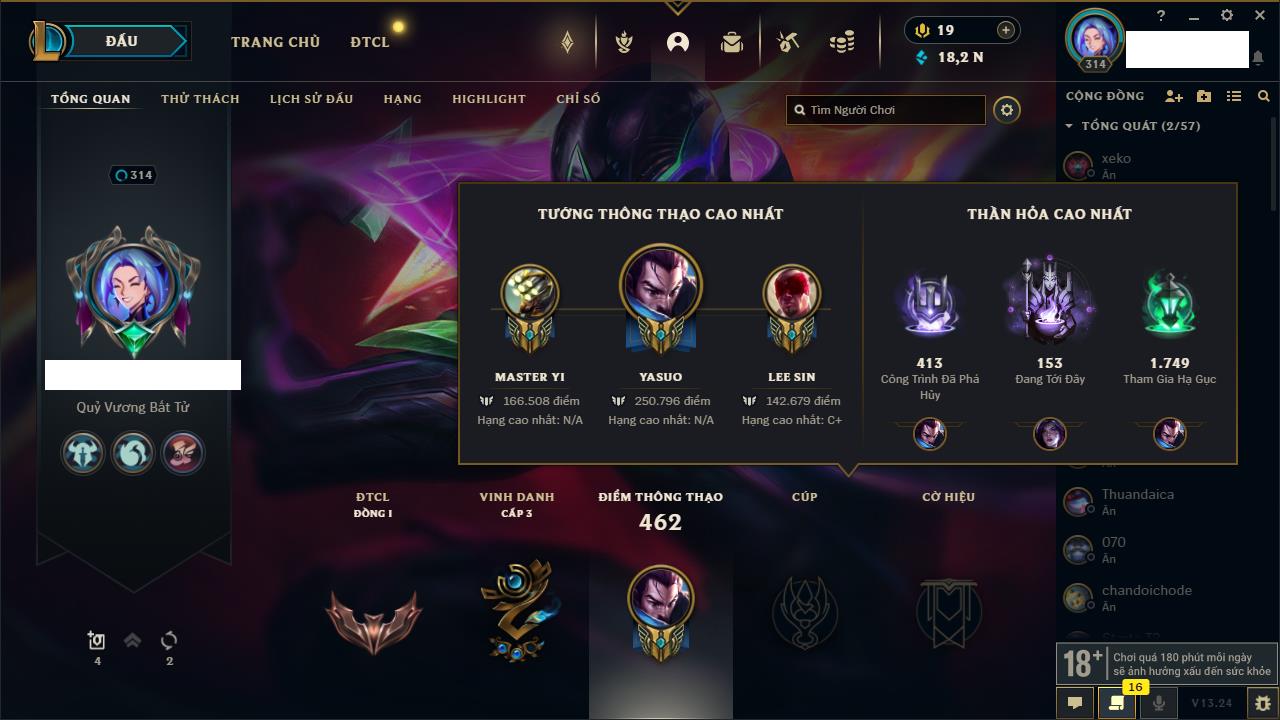 Rank Đơn: Bạc IIIKhung: Chưa có khungTướng: 171 - Còn 21493 THXTrang Phục: 252Rank ĐTCL: Bạch Kim IVLinh Thú: 123