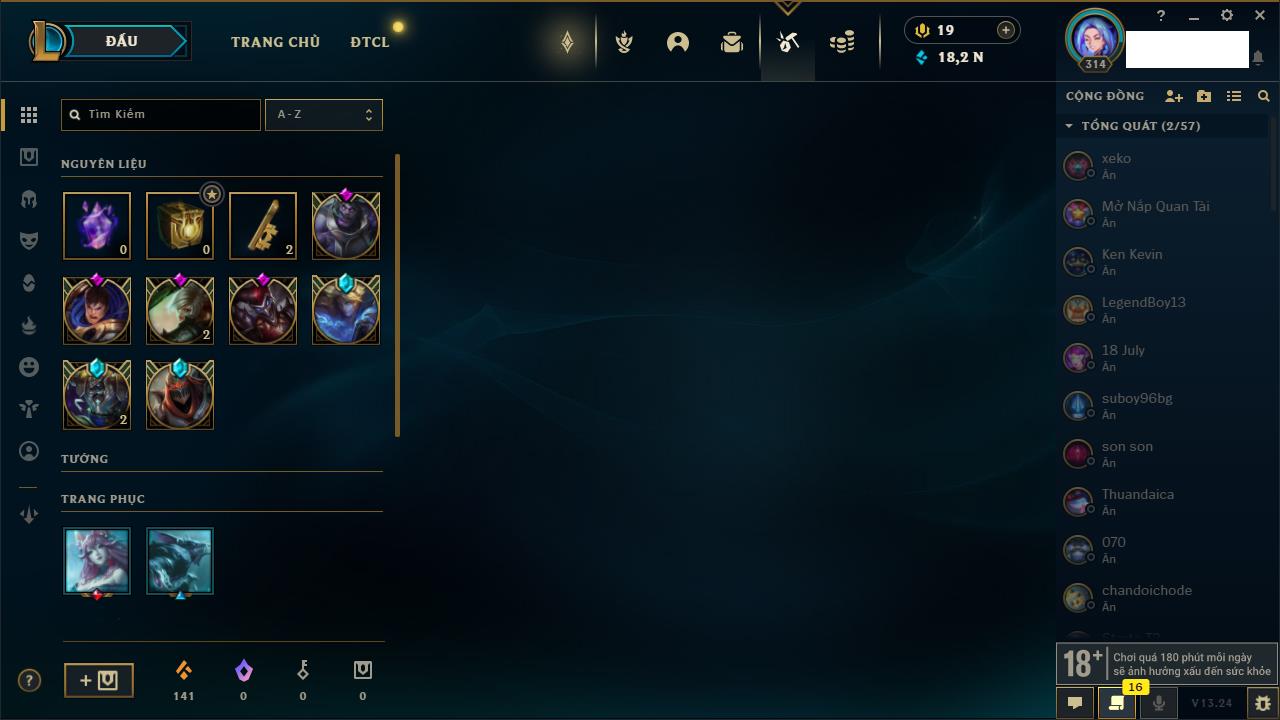 Rank Đơn: Vàng IIKhung: VàngTướng: 171 - Còn 34018 THXTrang Phục: 250Rank ĐTCL: Sắt IILinh Thú: 19