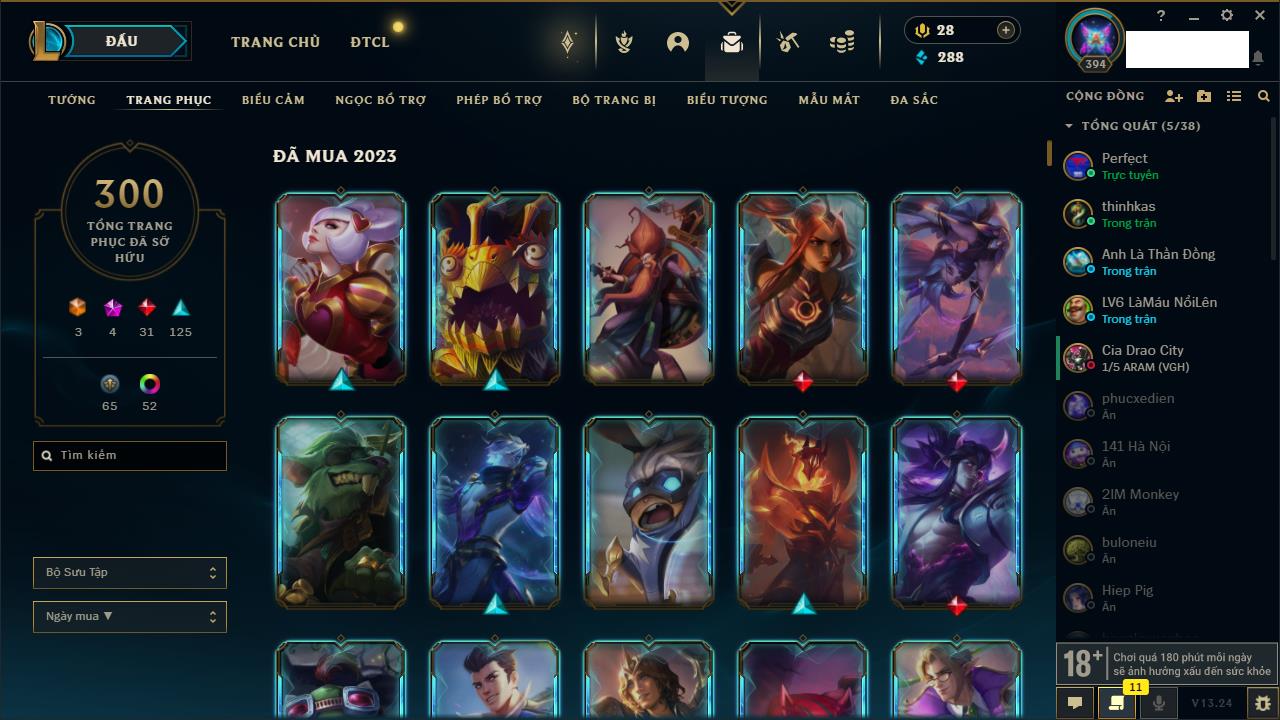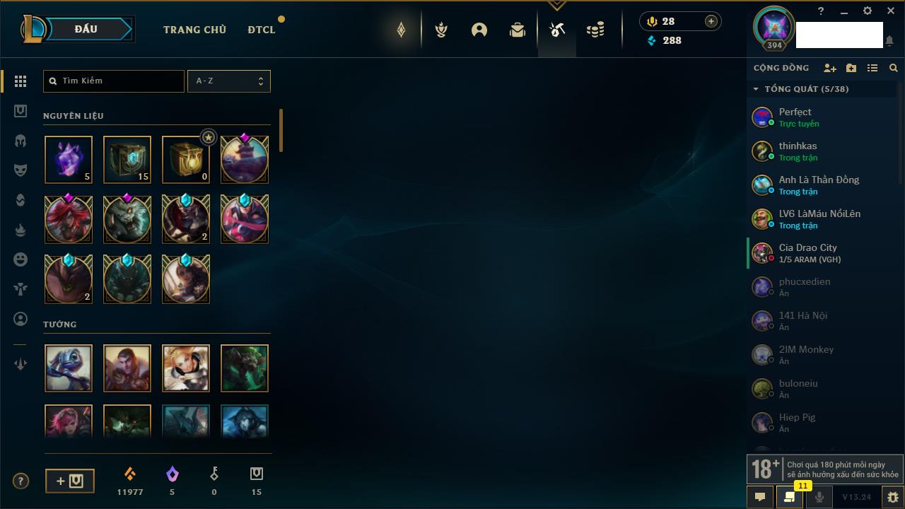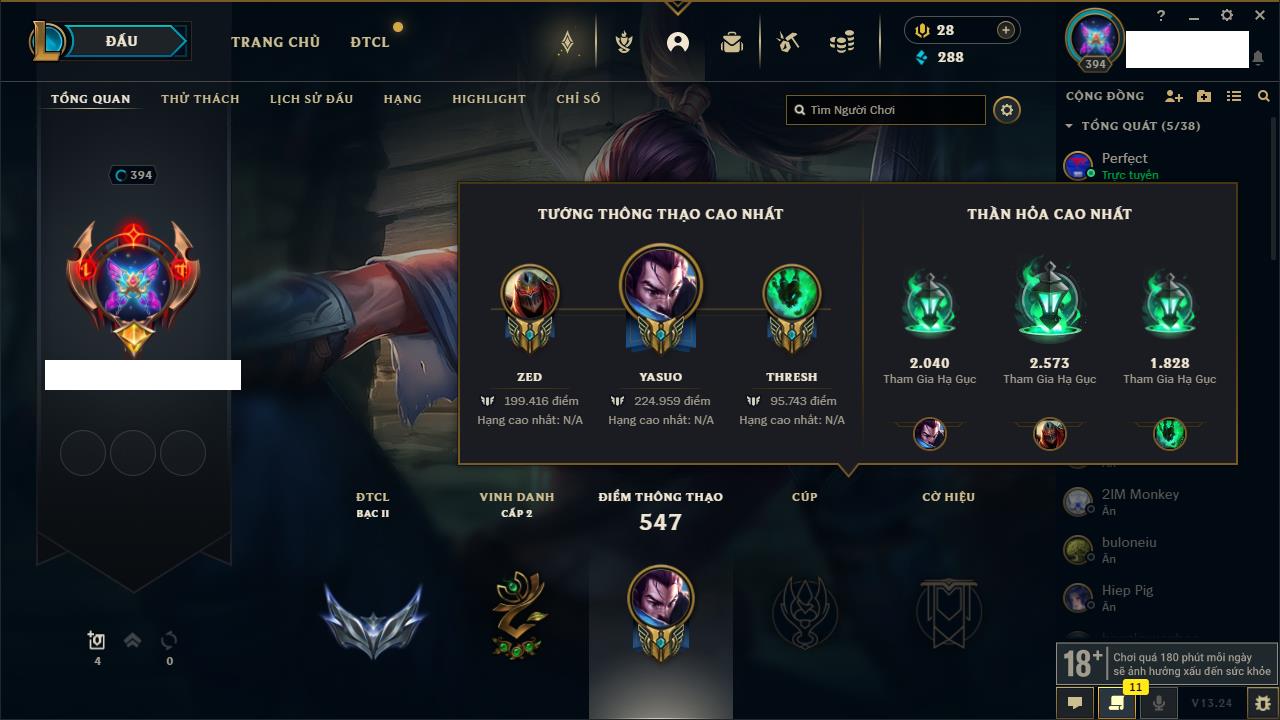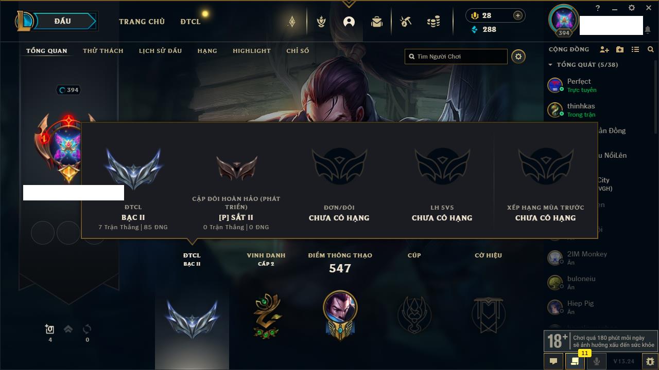 Rank Đơn: Vàng IIKhung: VàngTướng: 171 - Còn 219803 THXTrang Phục: 254Rank ĐTCL: Chưa RankLinh Thú: 78