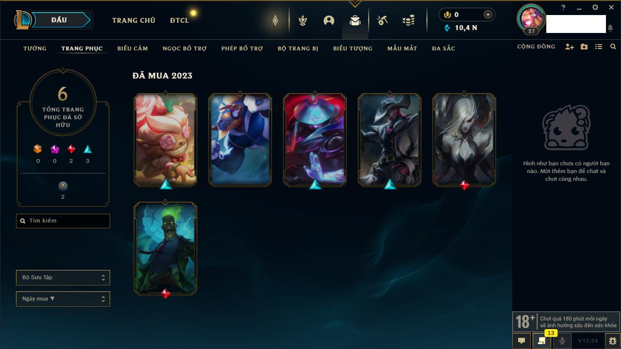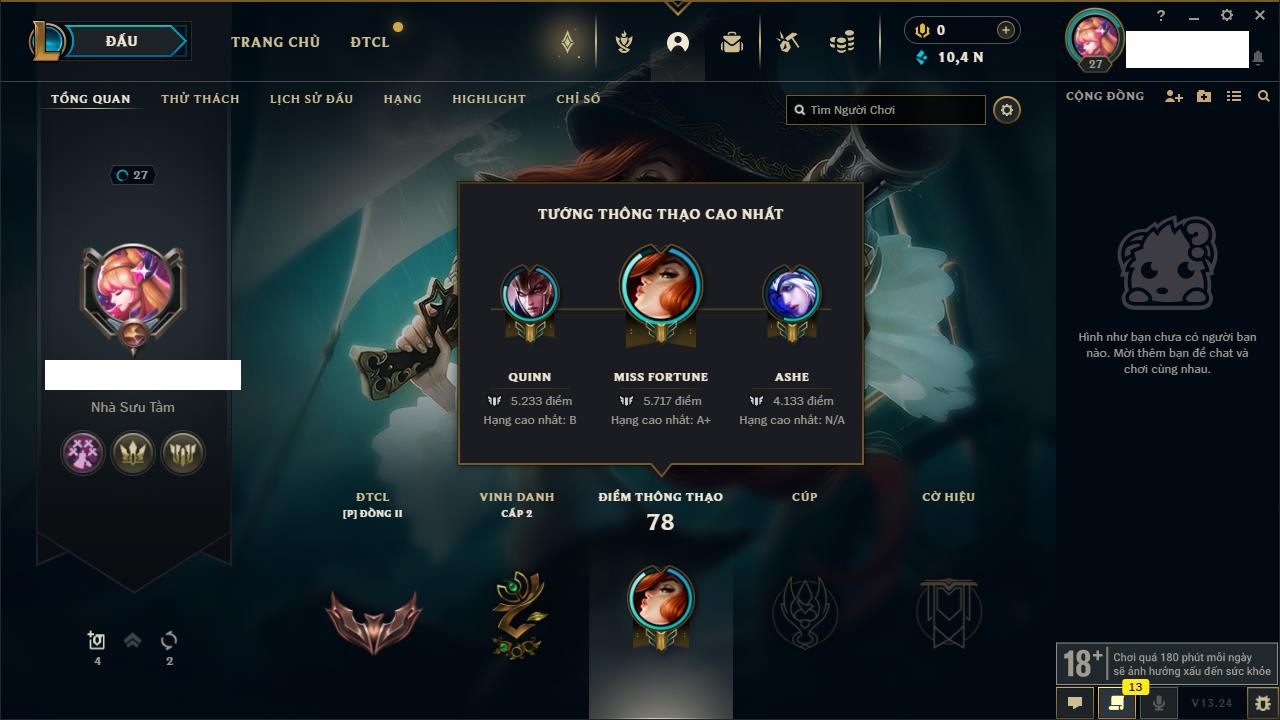 Rank Đơn: Chưa rank mùa nàoKhung: Chưa có khungTướng: 12 - Còn 3853 THXTrang Phục: 2Rank ĐTCL: Chưa RankLinh Thú: 30