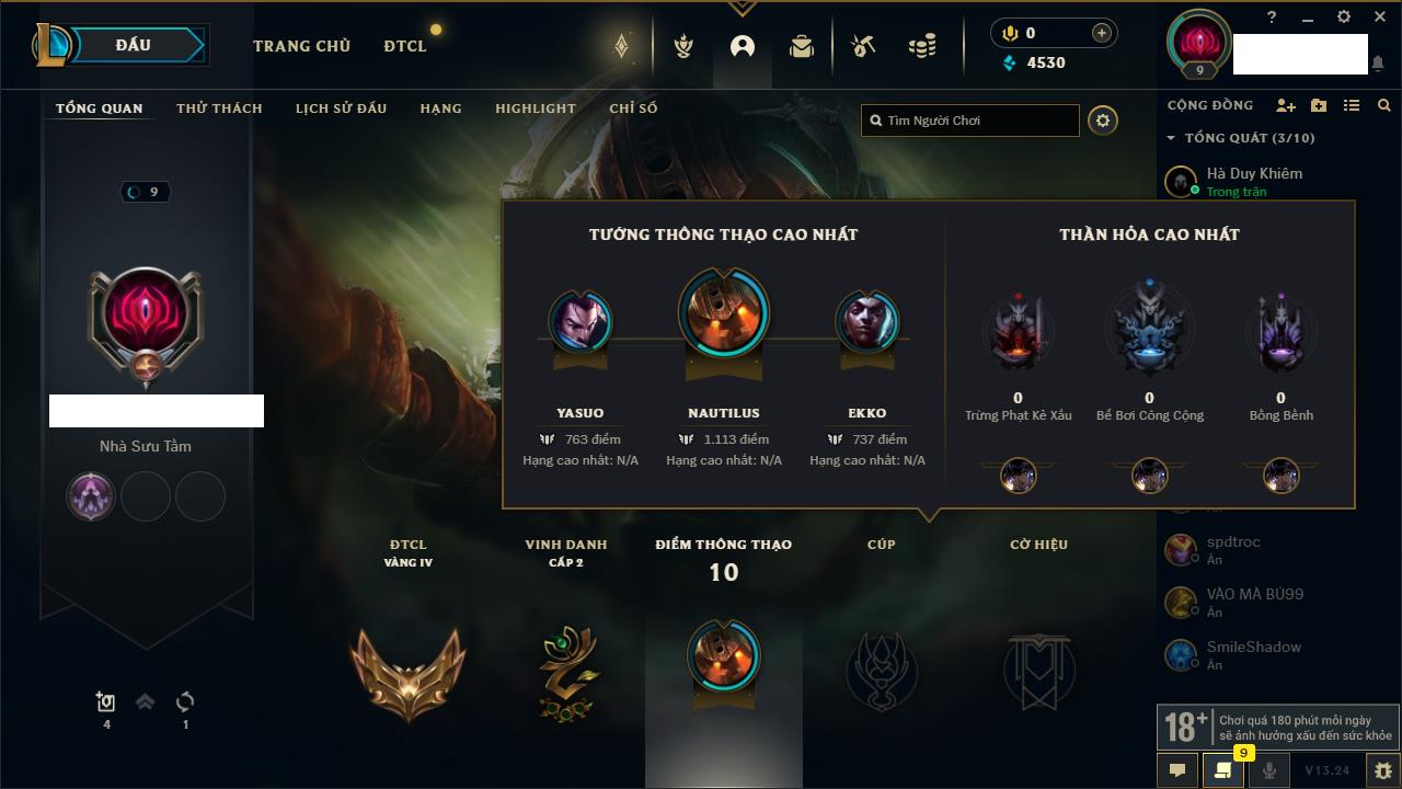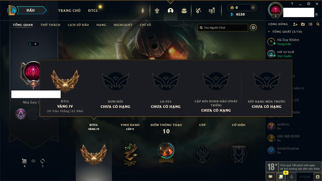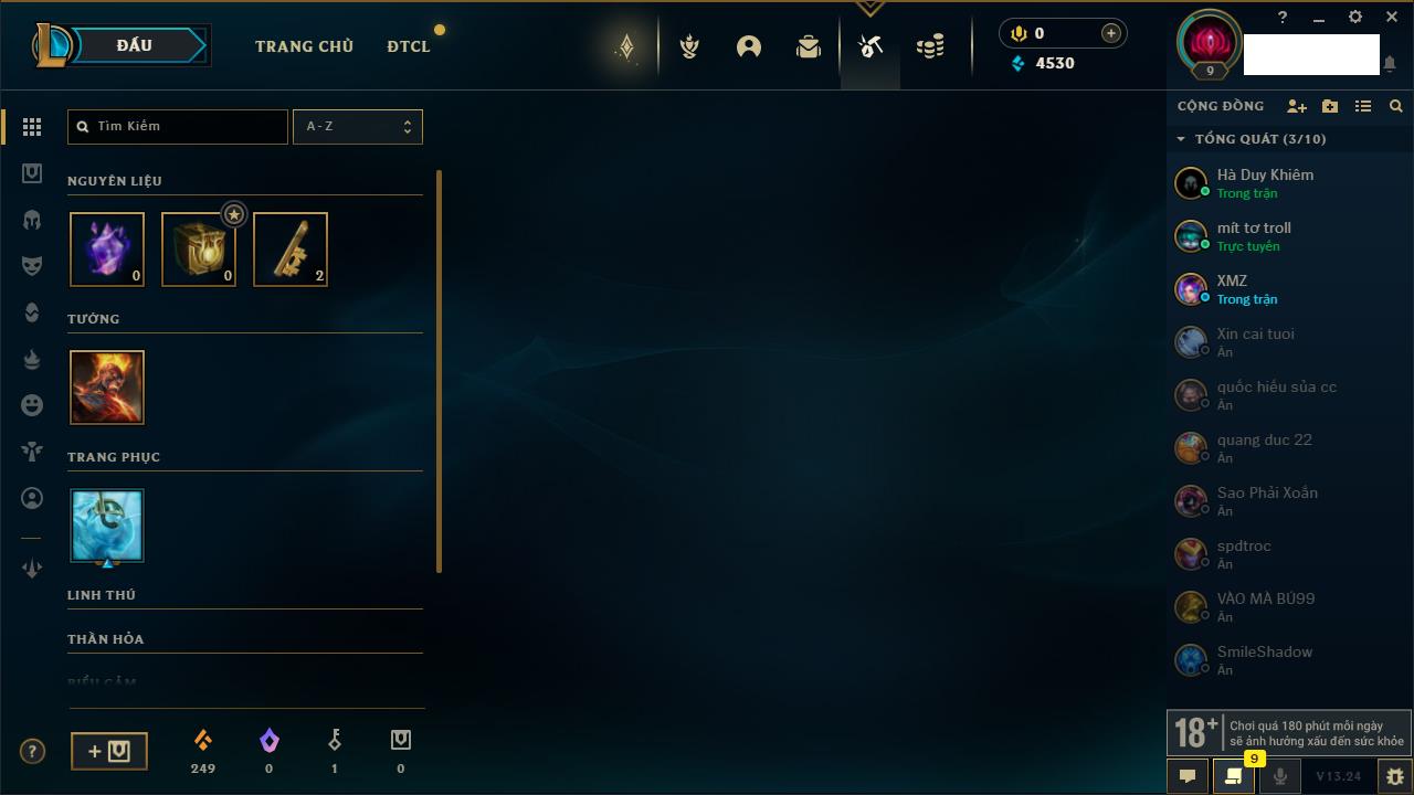 Rank Đơn: Chưa rank mùa nàoKhung: Chưa có khungTướng: 12 - Còn 3853 THXTrang Phục: 2Rank ĐTCL: Chưa RankLinh Thú: 30