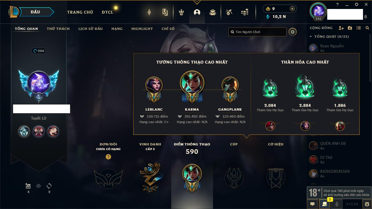 Rank Đơn: Đồng IIKhung: ĐồngTướng: 170 - Còn 66145 THXTrang Phục: 215Rank ĐTCL: Chưa RankLinh Thú: 52