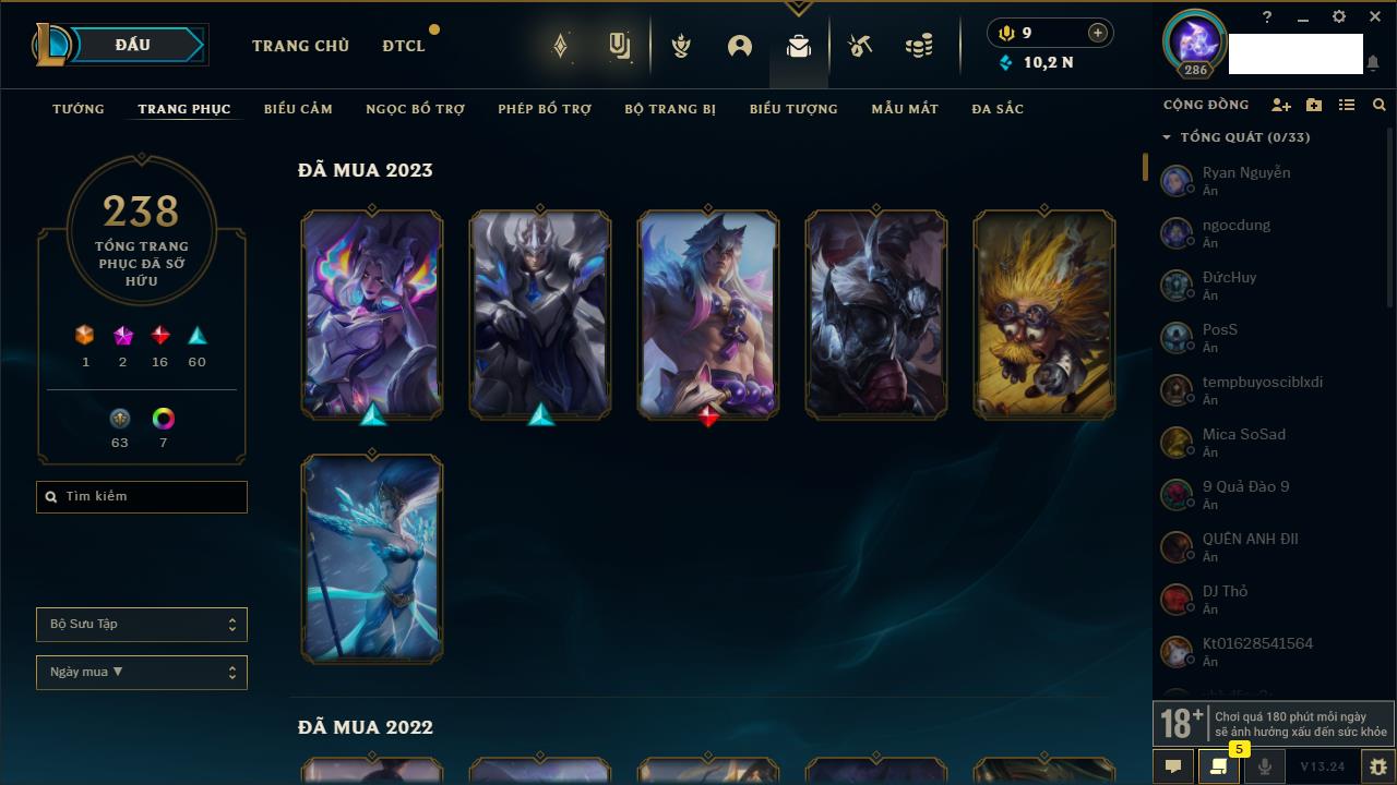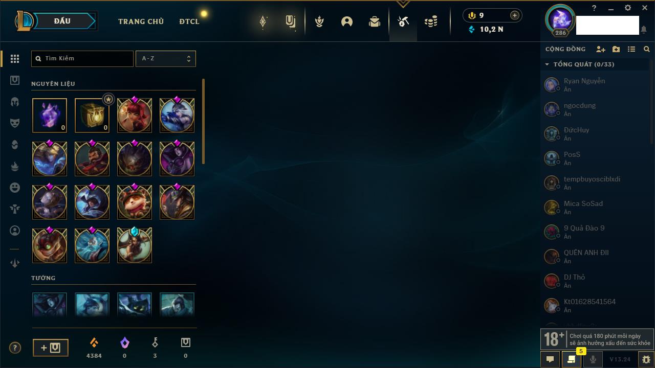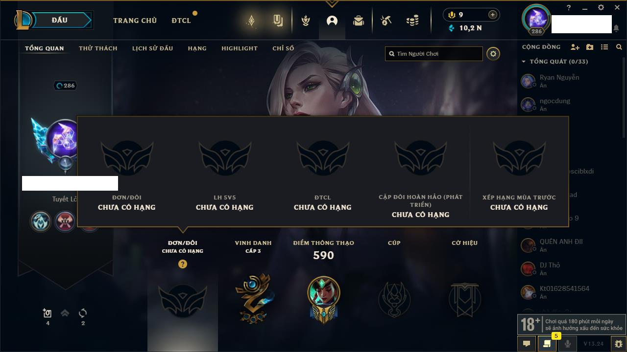 Rank Đơn: Vàng IIIKhung: BạcTướng: 171 - Còn 101359 THXTrang Phục: 88Rank ĐTCL: Kim Cương IVLinh Thú: 200