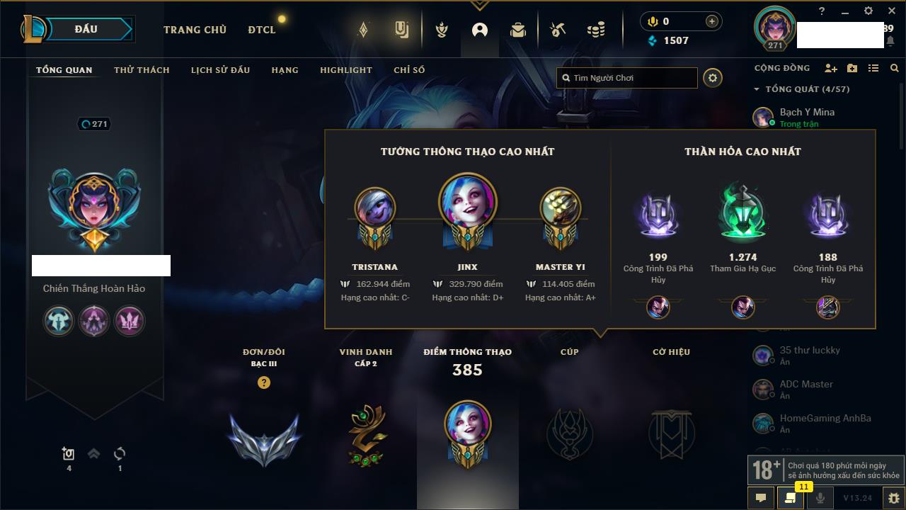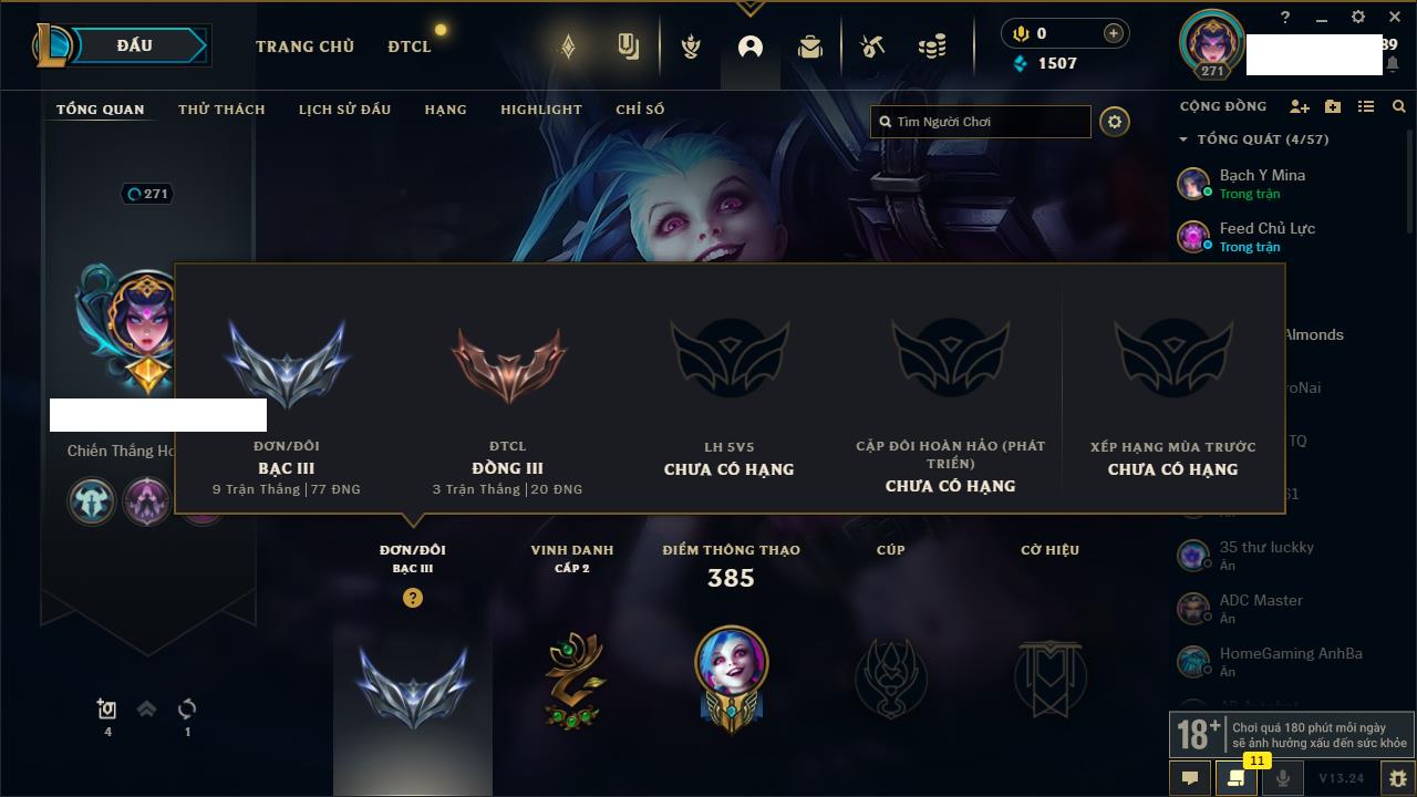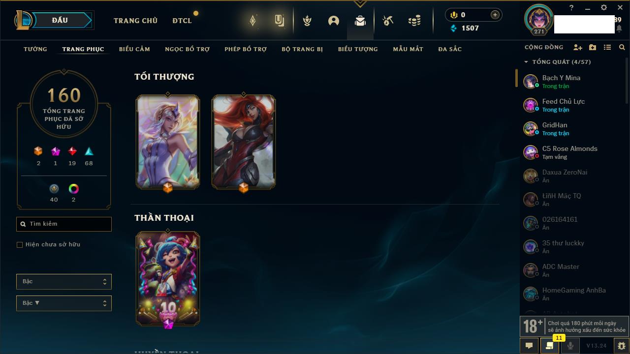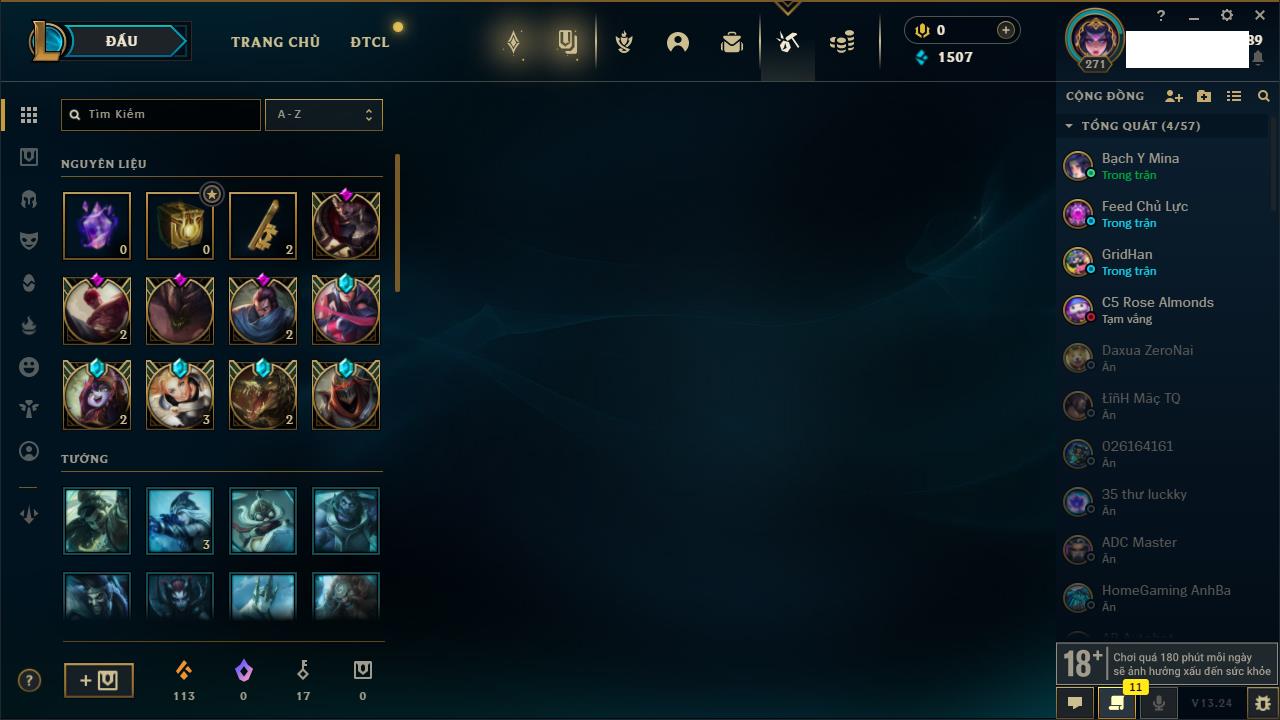 Rank Đơn: Chưa RankKhung: Chưa có khungTướng: 148 - Còn 2211 THXTrang Phục: 97Rank ĐTCL: Chưa RankLinh Thú: 77