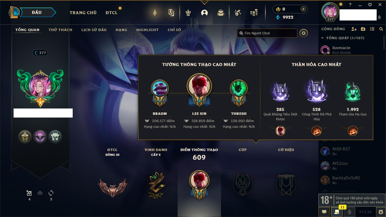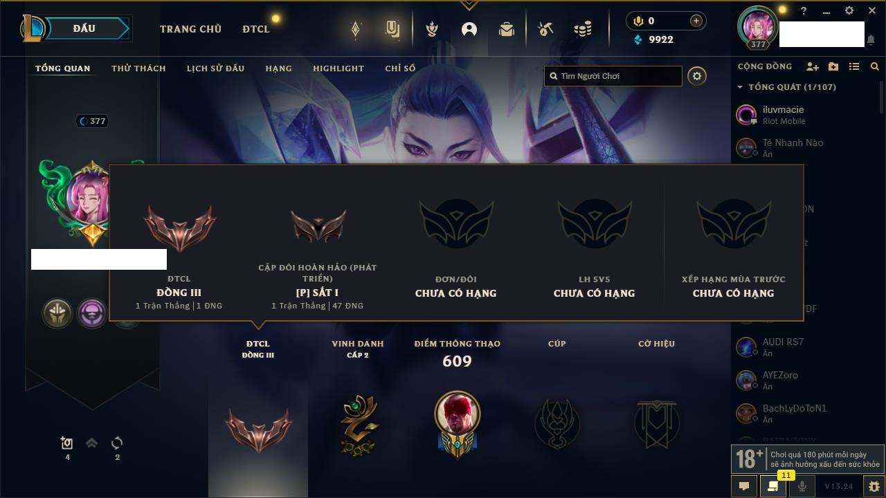 Rank Đơn: Bạc IIKhung: VàngTướng: 171 - Còn 332462 THXTrang Phục: 165Rank ĐTCL: Kim Cương IVLinh Thú: 181