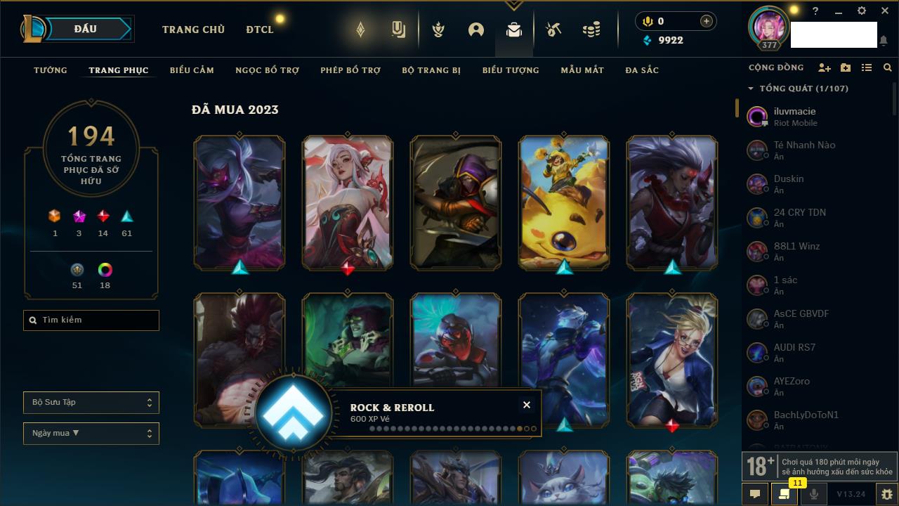 Rank Đơn: Bạc IVKhung: VàngTướng: 172 - Còn 358384 THXTrang Phục: 177Rank ĐTCL: Lục Bảo IILinh Thú: 211