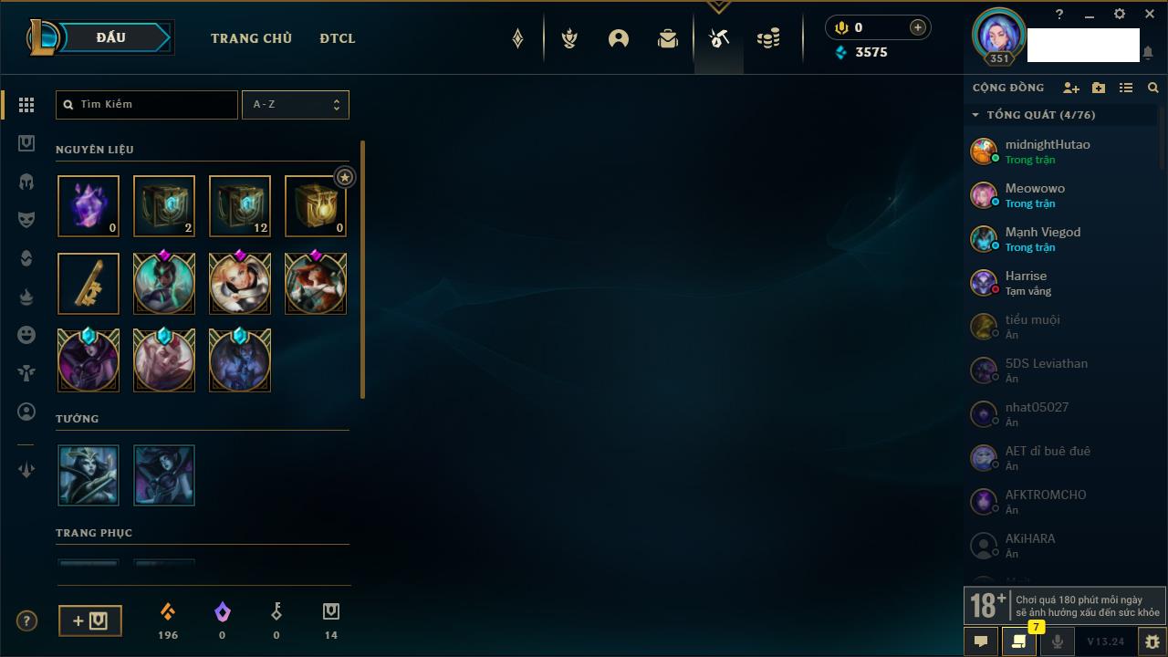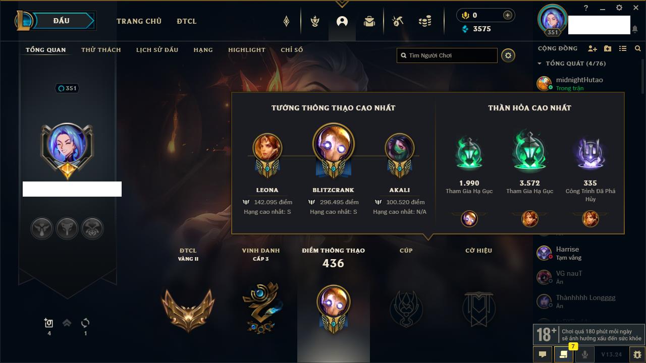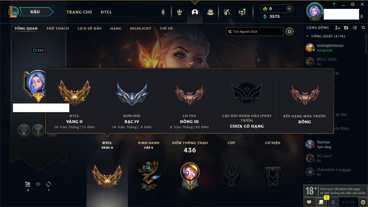 Rank Đơn: Bạch Kim IVKhung: VàngTướng: 171 - Còn 130280 THXTrang Phục: 226Rank ĐTCL: Kim Cương IVLinh Thú: 183