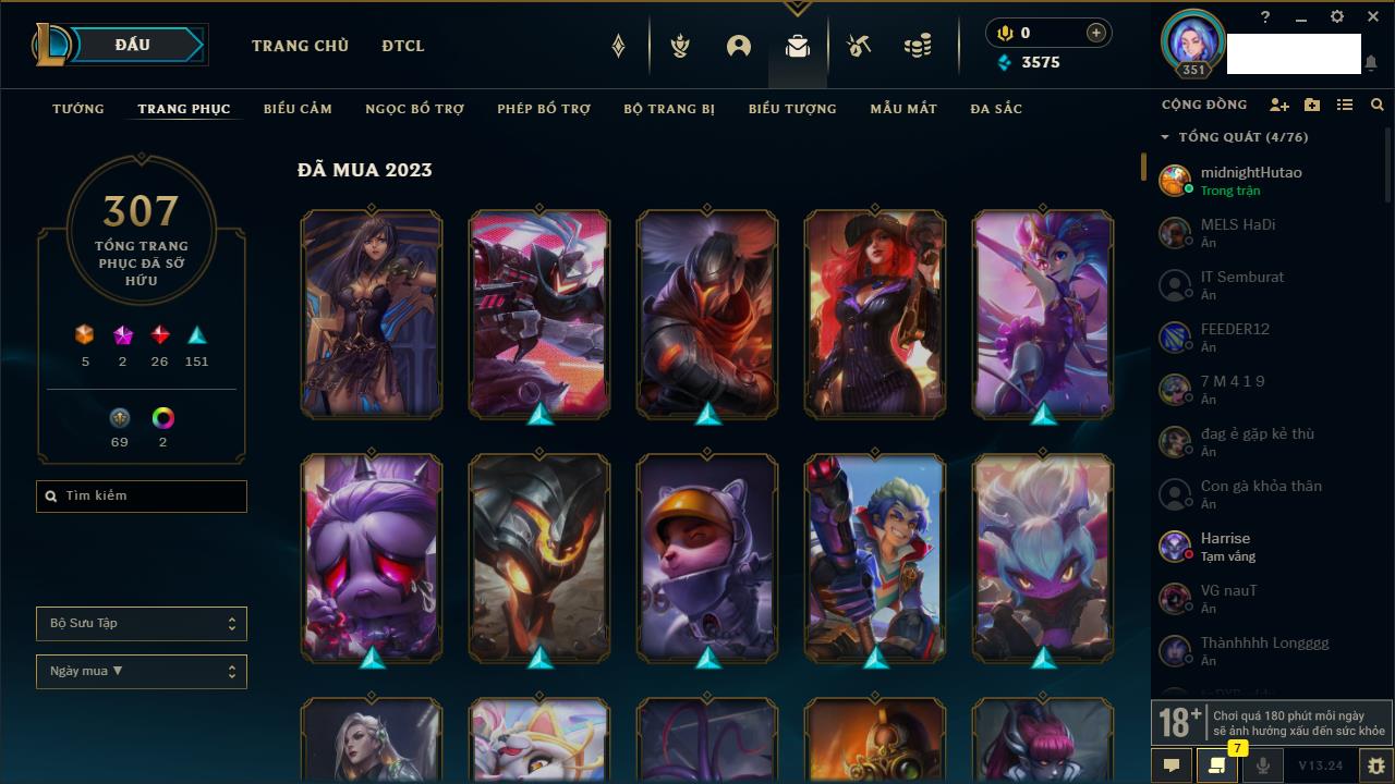 Rank Đơn: Vàng IIIKhung: Bạch kimTướng: 171 - Còn 98230 THXTrang Phục: 235Rank ĐTCL: Vàng IVLinh Thú: 59
