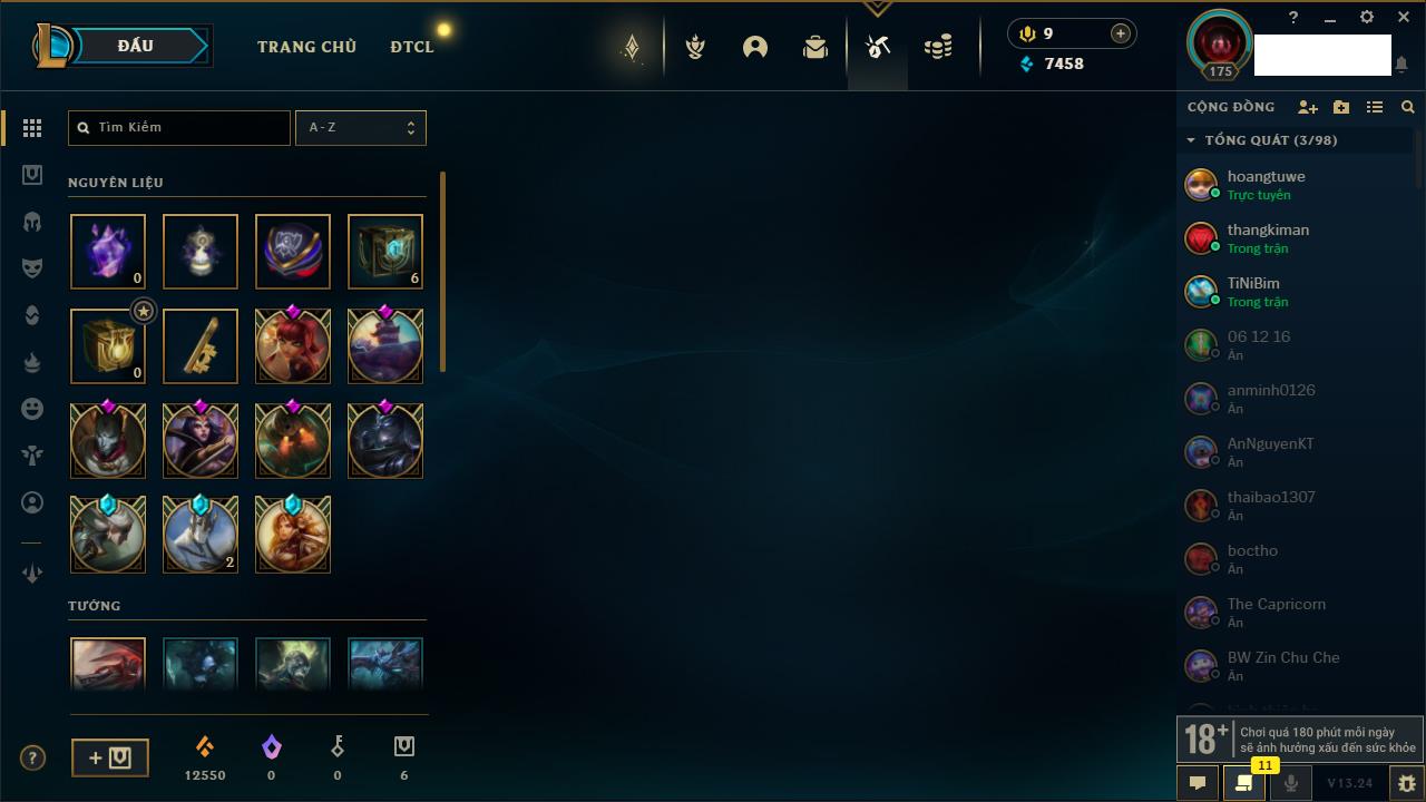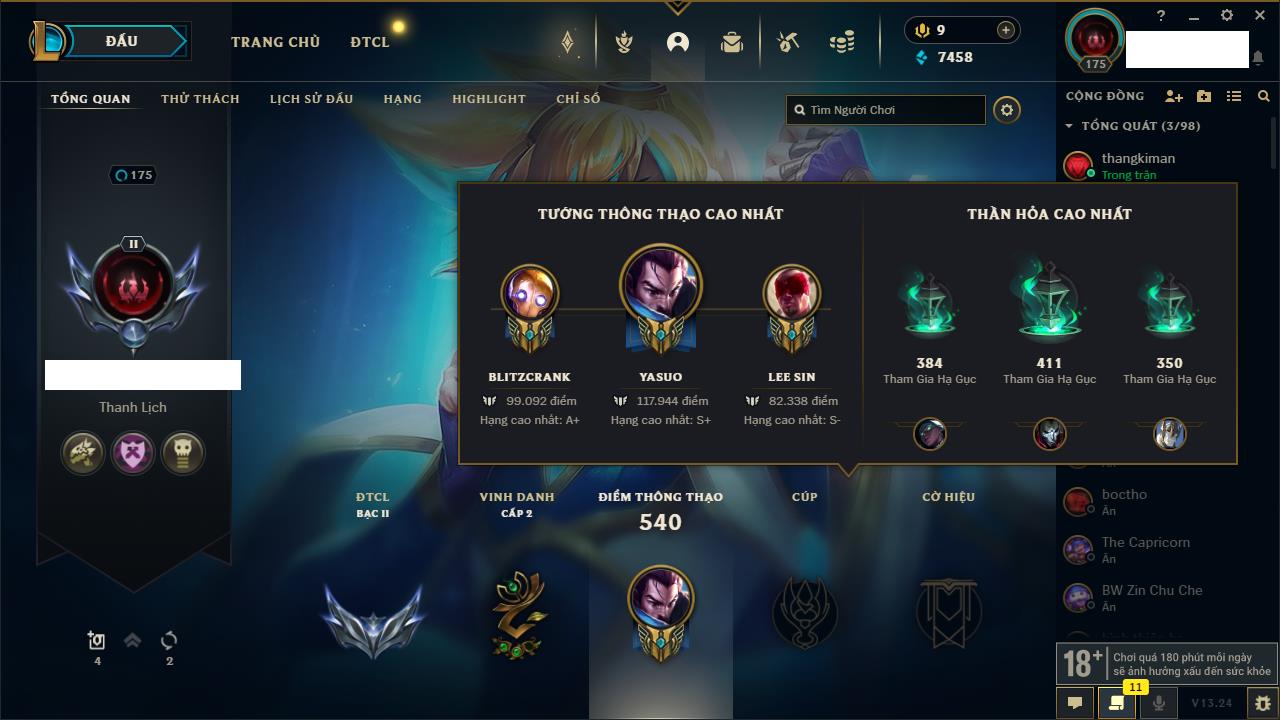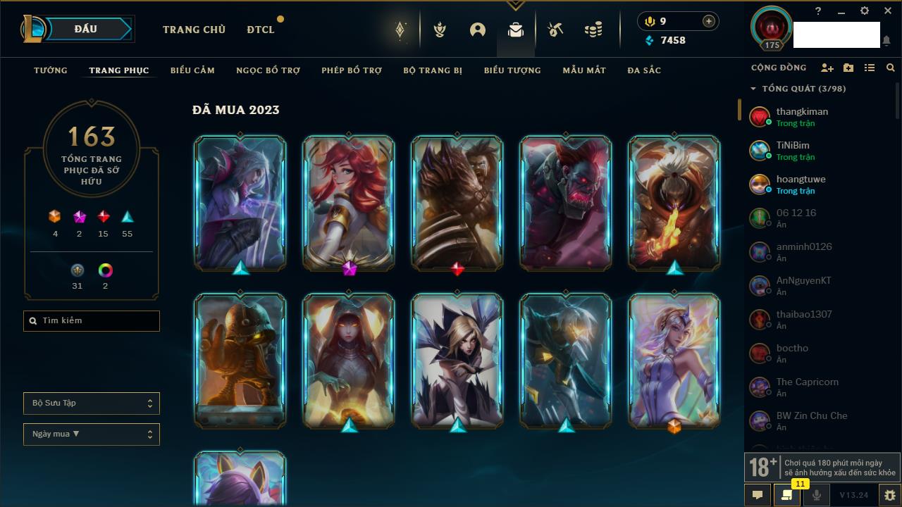 Rank Đơn: Vàng IVKhung: BạcTướng: 171 - Còn 426239 THXTrang Phục: 162Rank ĐTCL: Chưa RankLinh Thú: 33