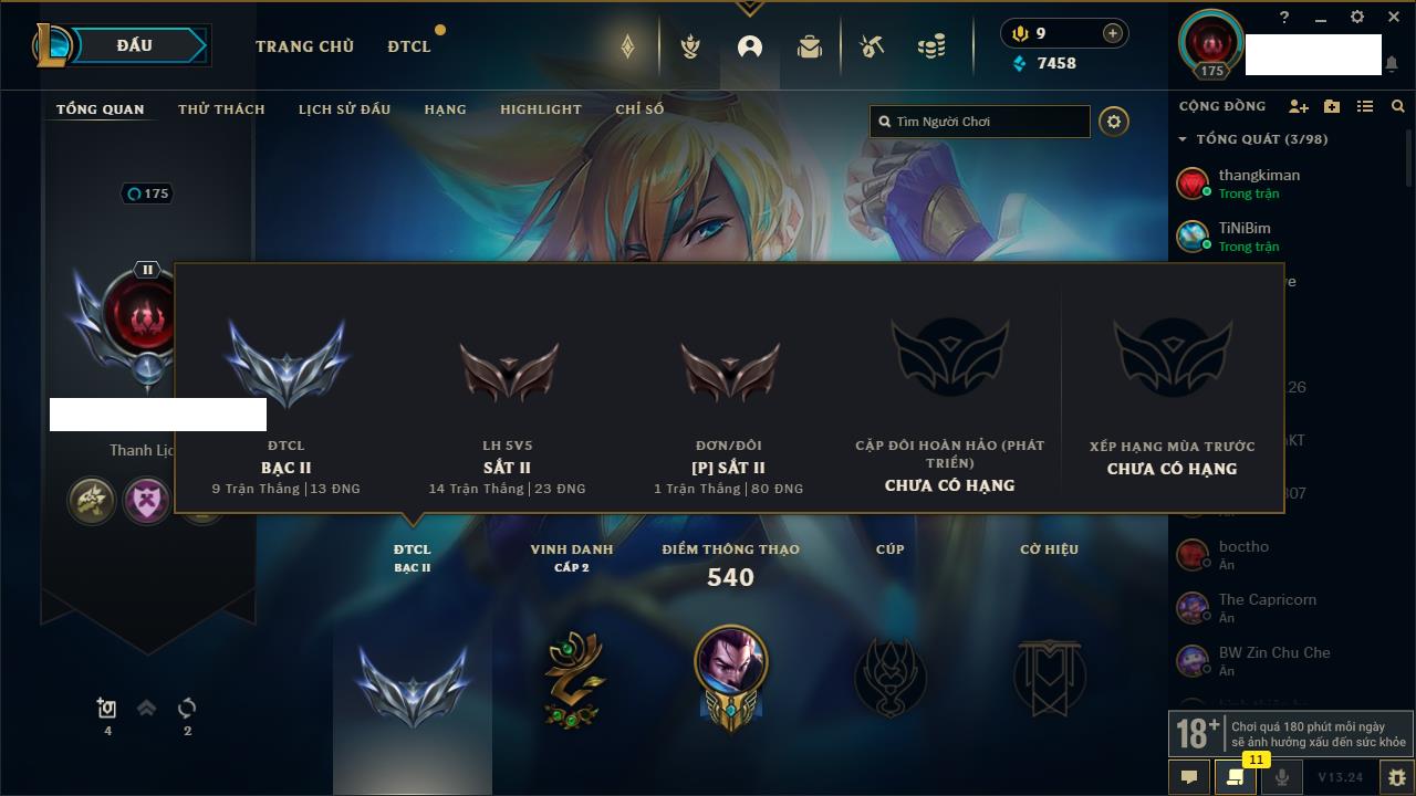 Rank Đơn: Bạc IIKhung: VàngTướng: 171 - Còn 332462 THXTrang Phục: 165Rank ĐTCL: Kim Cương IVLinh Thú: 181
