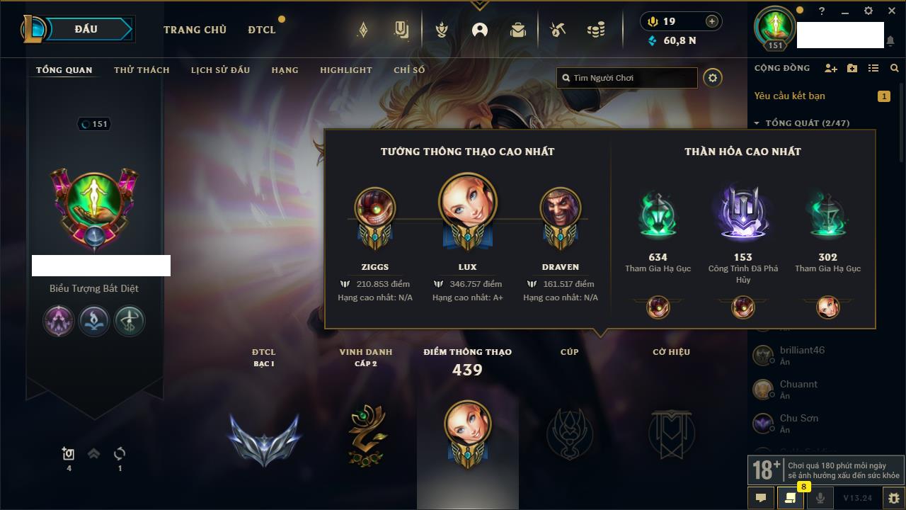 Rank Đơn: Chưa RankKhung: Chưa có khungTướng: 142 - Còn 5252 THXTrang Phục: 131Rank ĐTCL: Chưa RankLinh Thú: 45