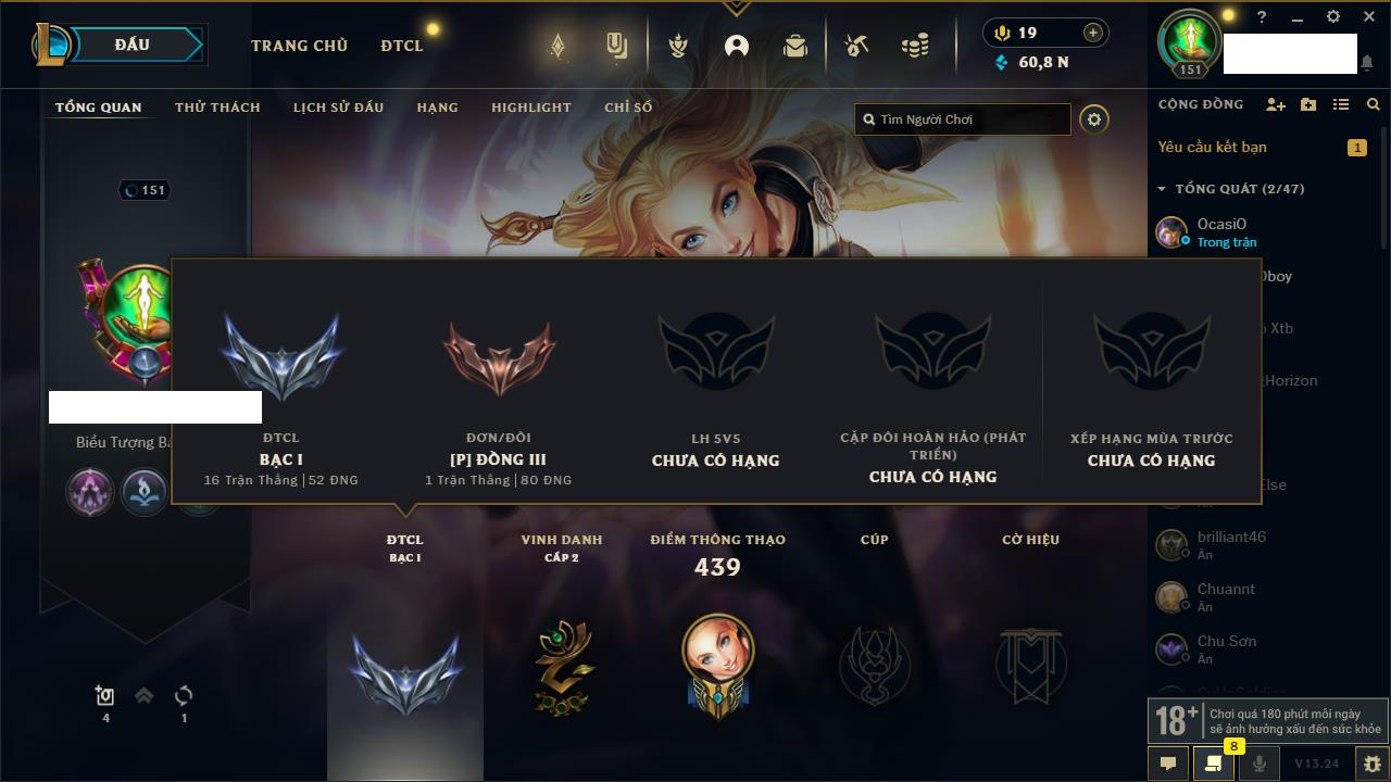 Rank Đơn: Đồng IIKhung: Chưa có khungTướng: 108 - Còn 14031 THXTrang Phục: 92Rank ĐTCL: Chưa RankLinh Thú: 19