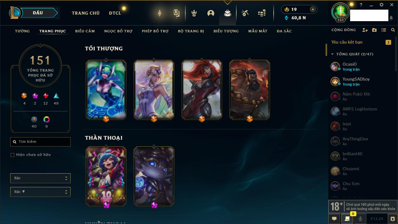 Rank Đơn: Chưa RankKhung: Chưa có khungTướng: 162 - Còn 23234 THXTrang Phục: 150Rank ĐTCL: Chưa RankLinh Thú: 42
