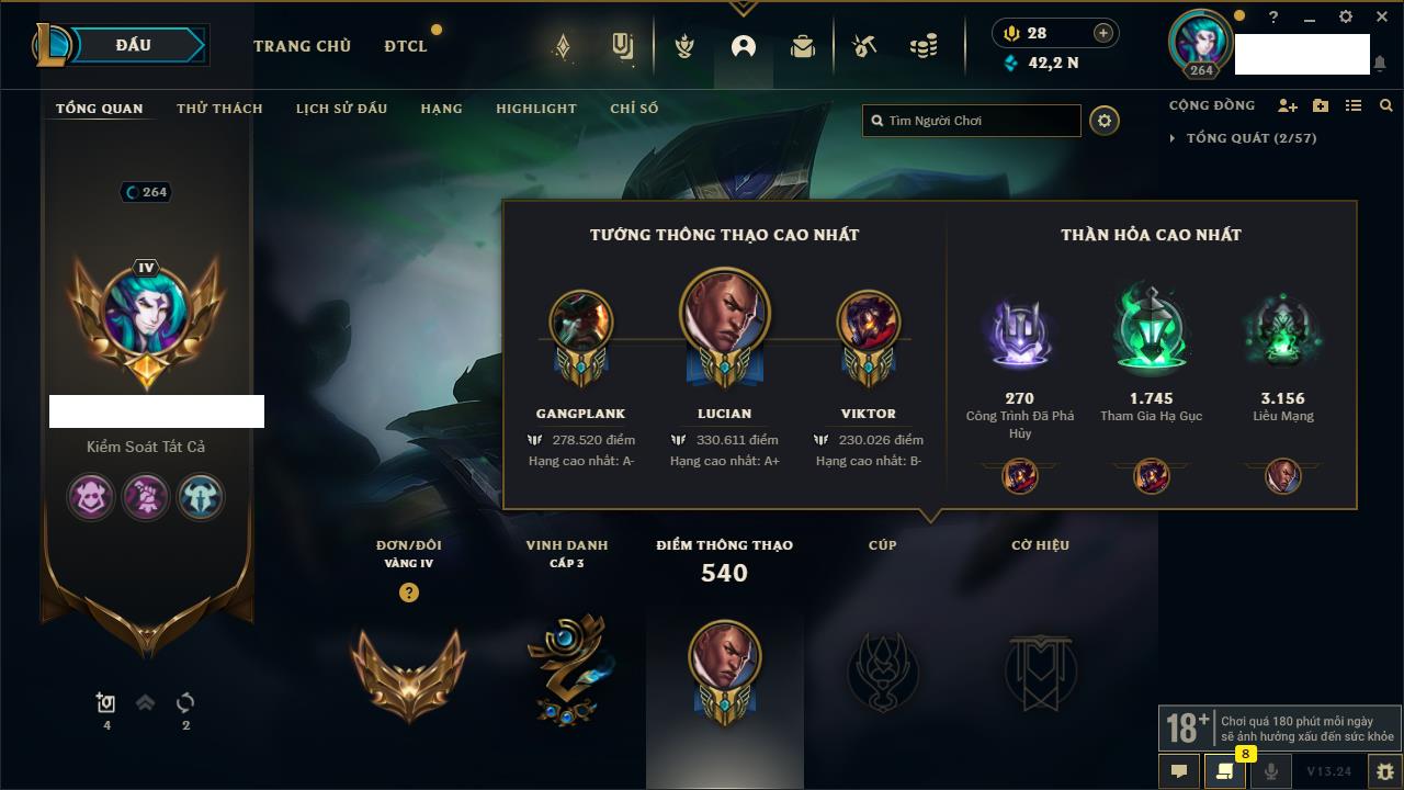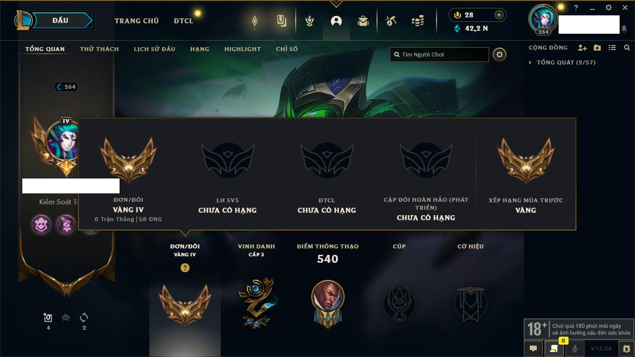Rank Đơn: Vàng IVKhung: VàngTướng: 170 - Còn 84355 THXTrang Phục: 199Rank ĐTCL: Chưa RankLinh Thú: 116
