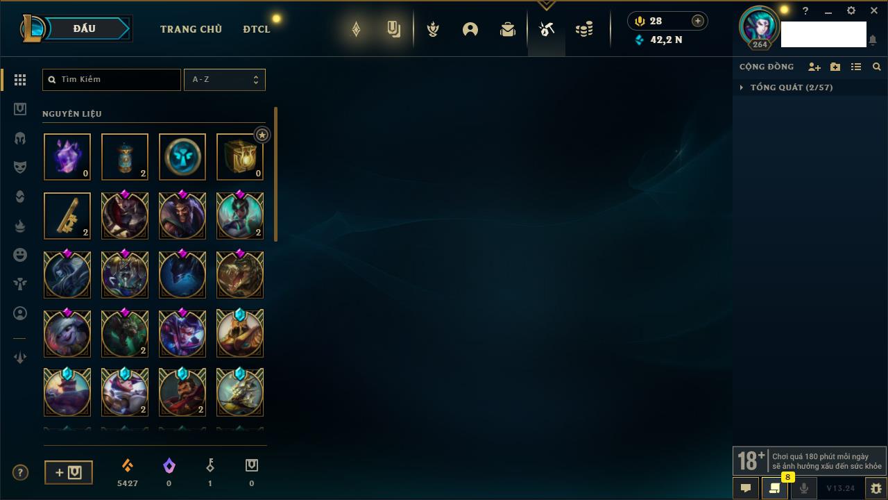 Rank Đơn: Bạc IIIKhung: BạcTướng: 171 - Còn 51045 THXTrang Phục: 220Rank ĐTCL: Sắt IILinh Thú: 141