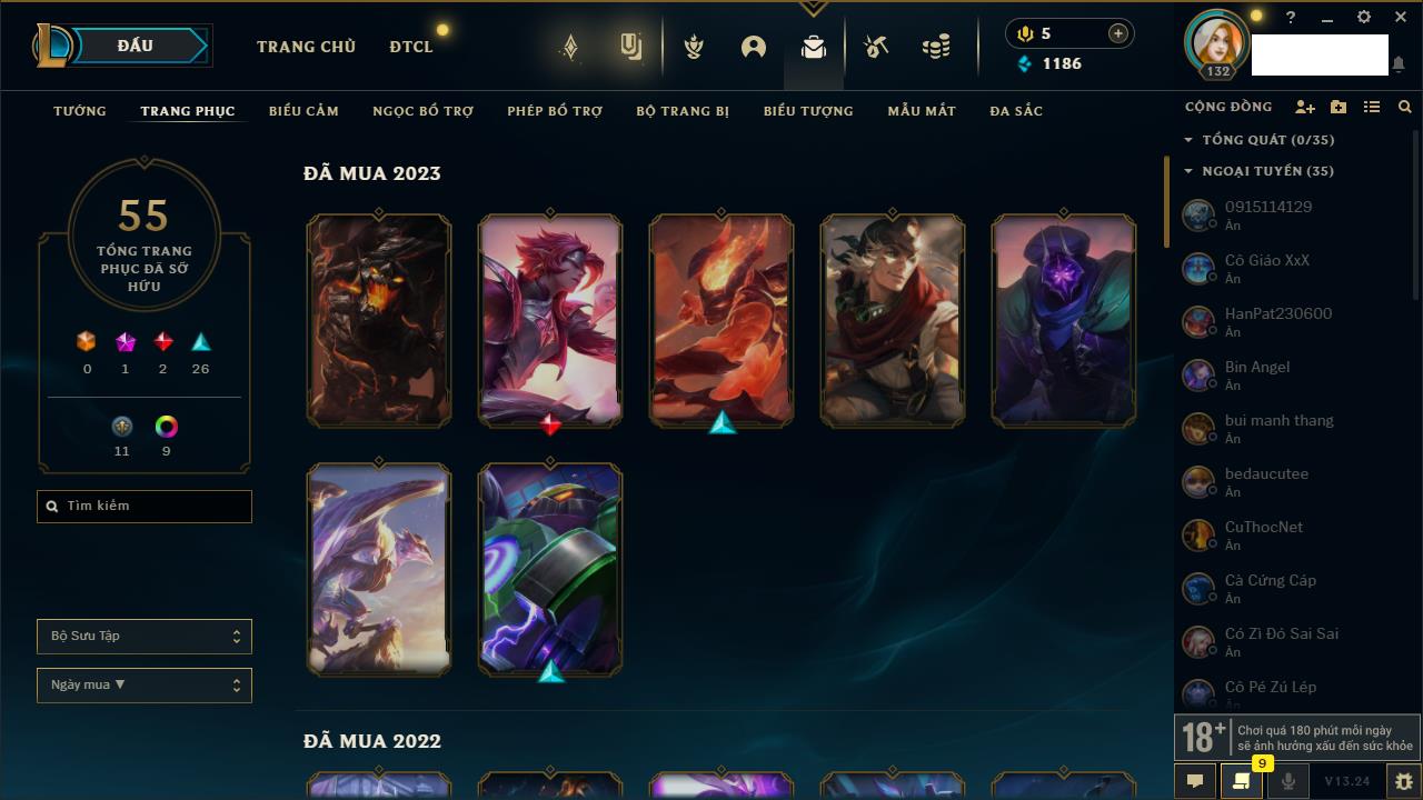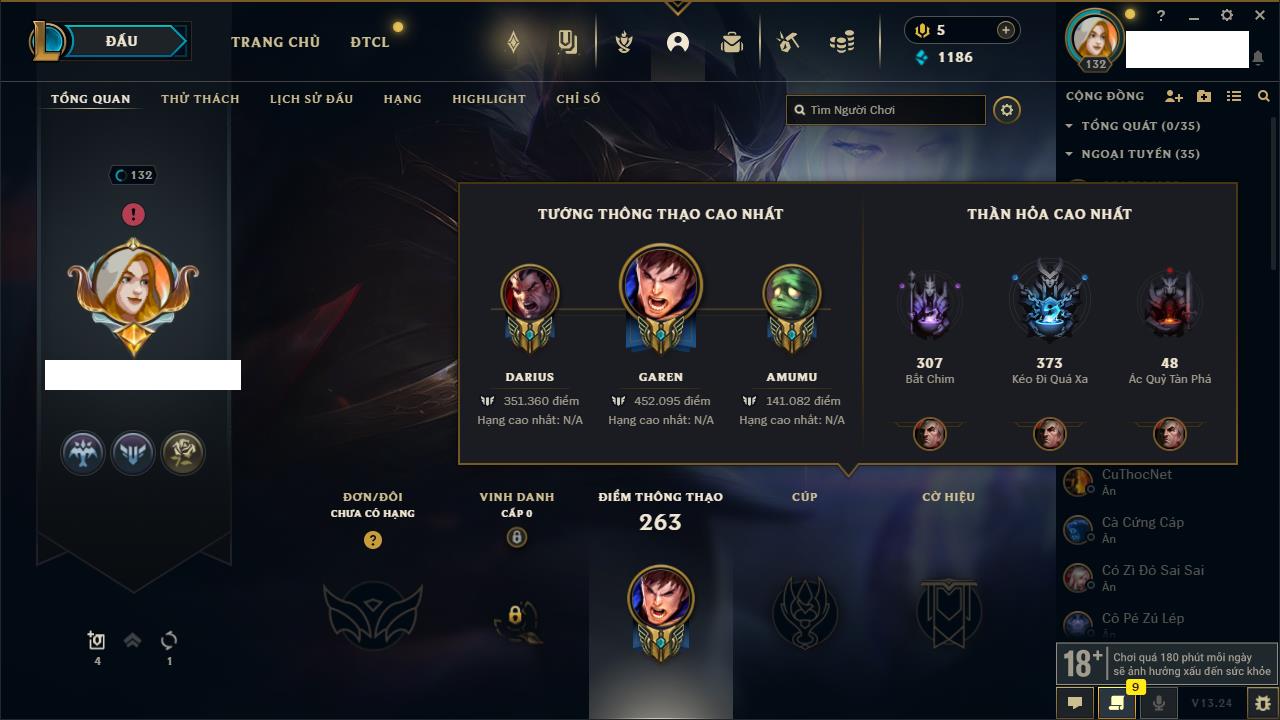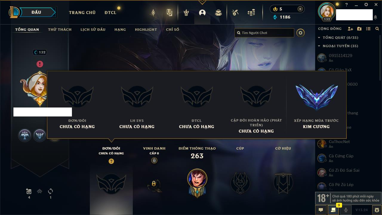 Rank Đơn: Chưa rank mùa nàoKhung: Chưa có khungTướng: 161 - Còn 11380 THXTrang Phục: 13Rank ĐTCL: Chưa RankLinh Thú: 74
