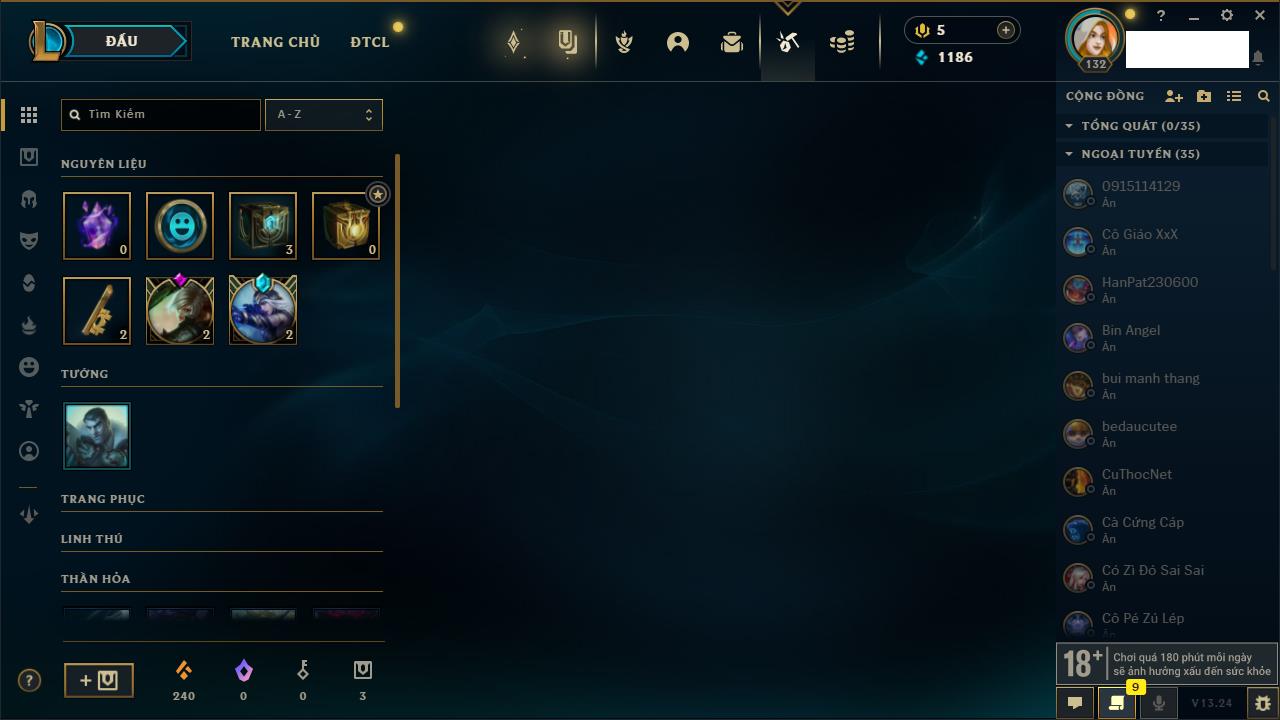 Rank Đơn: Chưa rank mùa nàoKhung: Chưa có khungTướng: 157 - Còn 8409 THXTrang Phục: 12Rank ĐTCL: Chưa RankLinh Thú: 74